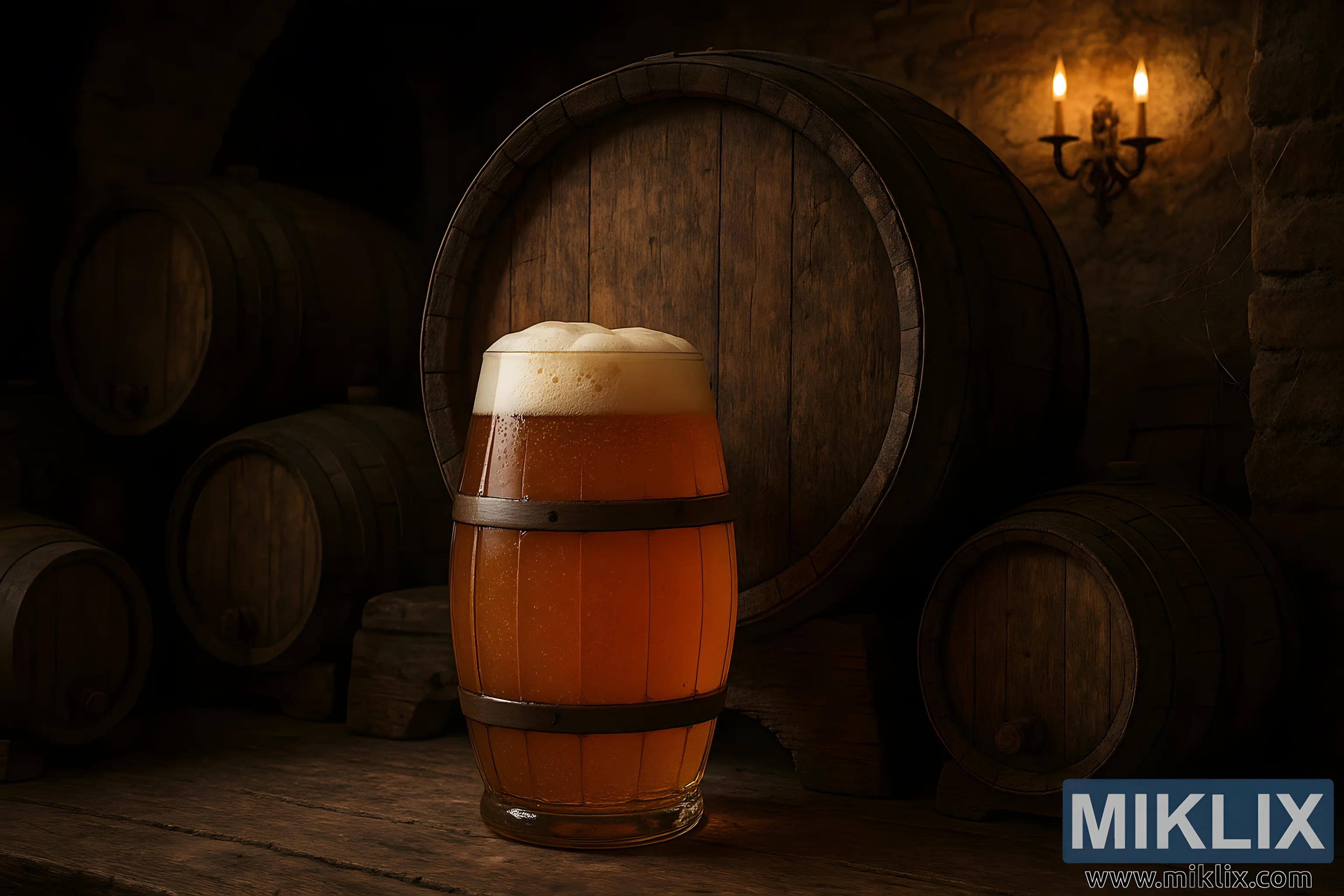denne rikt teksturerte scenen transporterer bildet betrakteren inn i hjertet av et tradisjonelt bryggeri eller en lagringskjeller, hvor tiden ser ut til å gå sakte og håndverk står i sentrum. Rommet er gjennomsyret av en varm, ravfarget atmosfære, som fremkaller den stille ærbødigheten til et rom dedikert til den langsomme, bevisste gjæringskunsten. Bakgrunnen dominerer en stor øltønne av tre, med buede stenger og jernbånd forvitret av mange års bruk. Rundt den er det flere mindre tønner, hver omhyggelig arrangert mot en robust steinmur som taler til omgivelsenes alder og autentisitet. Disse tønnene, sannsynligvis brukt til lagring av forskjellige øl, bærer den stille vekten av tradisjon, med overflater preget av subtile flekker og tidens patina.