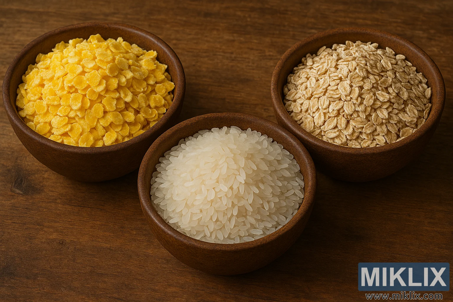Tre rustikke boller viser flaket mais, hvit ris og bygg, og fremhever sunne bryggeingredienser på tre.