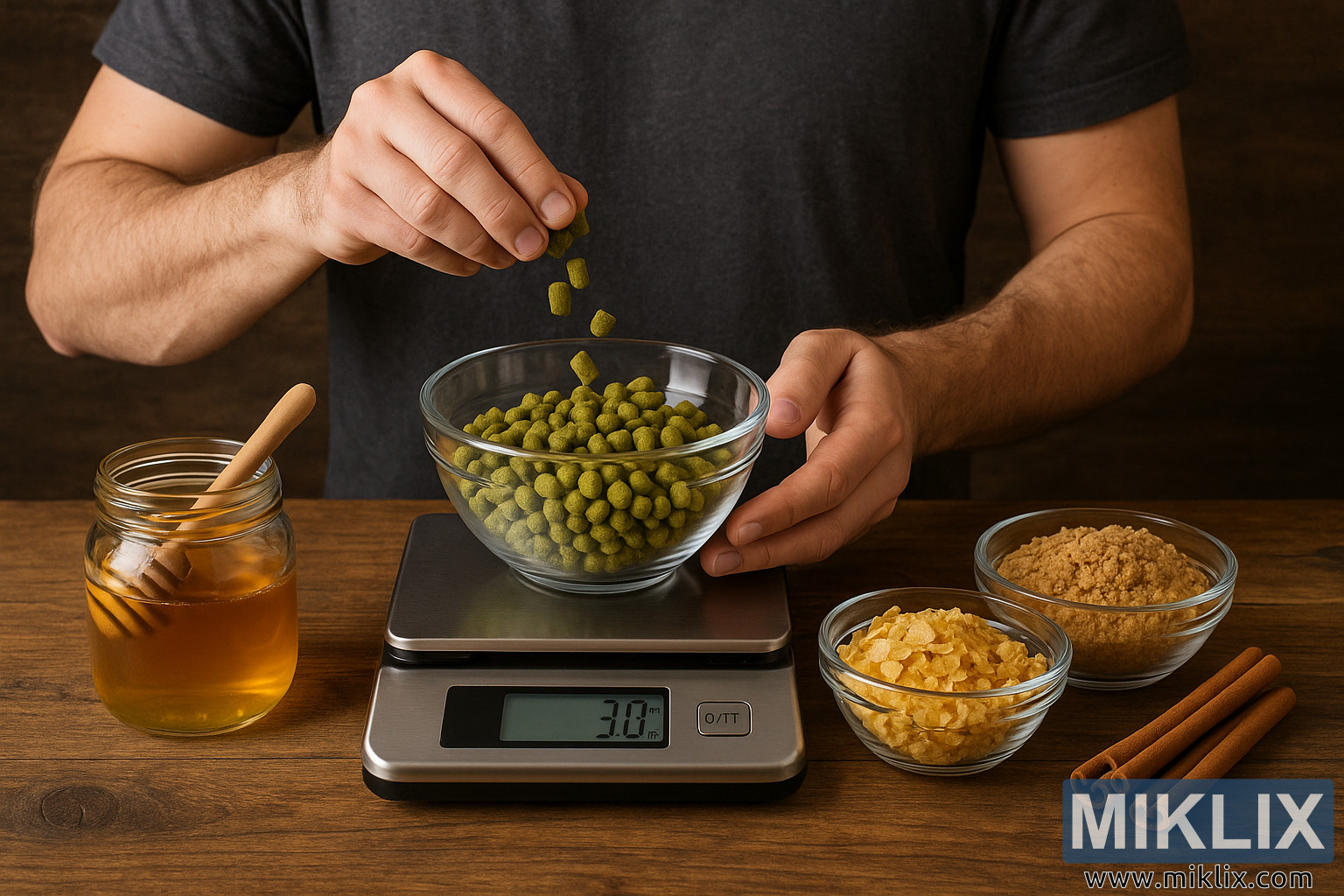 En hjemmebrygger måler nøye 30 g humlepellets i digital skala, omgitt av honning, sukker, mais og kanel på et rustikk bord.