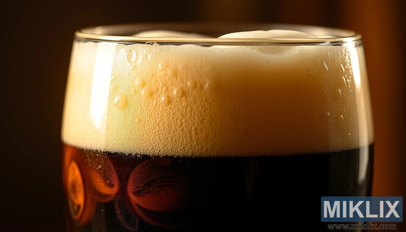 Nærbilde av brent byggøl med kremet hode og mahognifarge, glødende i varmt lys, fremkaller toner av espresso, mørk sjokolade og subtil bitterhet.