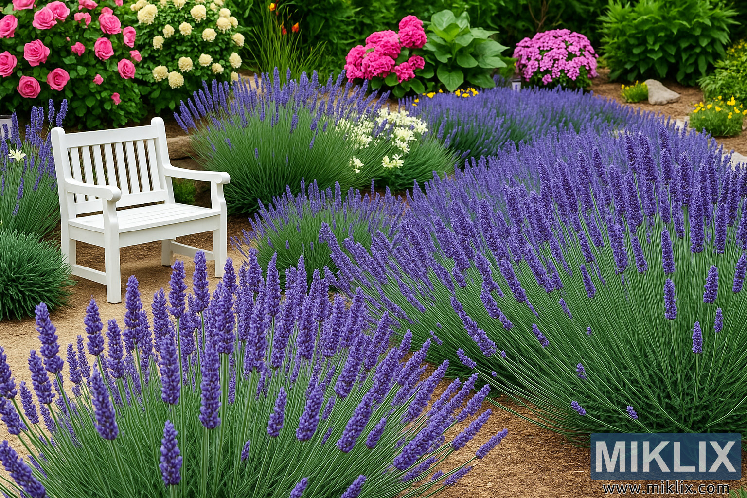 Tranquil Lavender Garden with Bench and Summer Blooms
