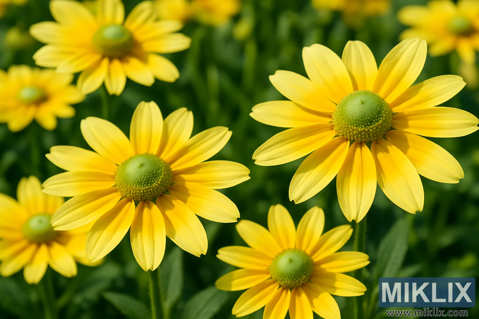 Dette landskapsfotografiet i høy oppløsning gir et lysende nærbilde av Rudbeckia 'Prairie Sun', en blomst kjent for sine muntre tofargede stråler og den karakteristiske grønne sentrale kjeglen. Rammen er fylt med åpne, tusenfrydlignende blomster, med kronblader arrangert i skarp, radial rekkefølge rundt sentre som gløder i en frisk chartreuse-farge. Sollys fra en lys sommerdag strømmer over landskapet og intensiverer de klare gule fargene samtidig som det etterlater et kjølig, mintaktig skjær over de kuppelformede skivene. Den overordnede effekten er livlig og luftig, som om blomstene var små soler som svever over en eng av myk grønnfarge.
