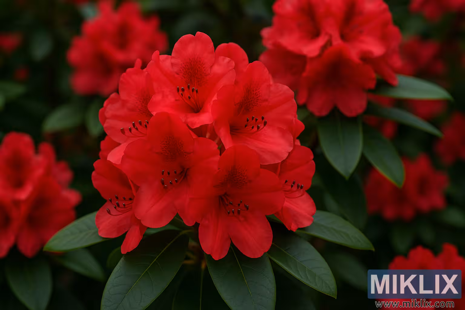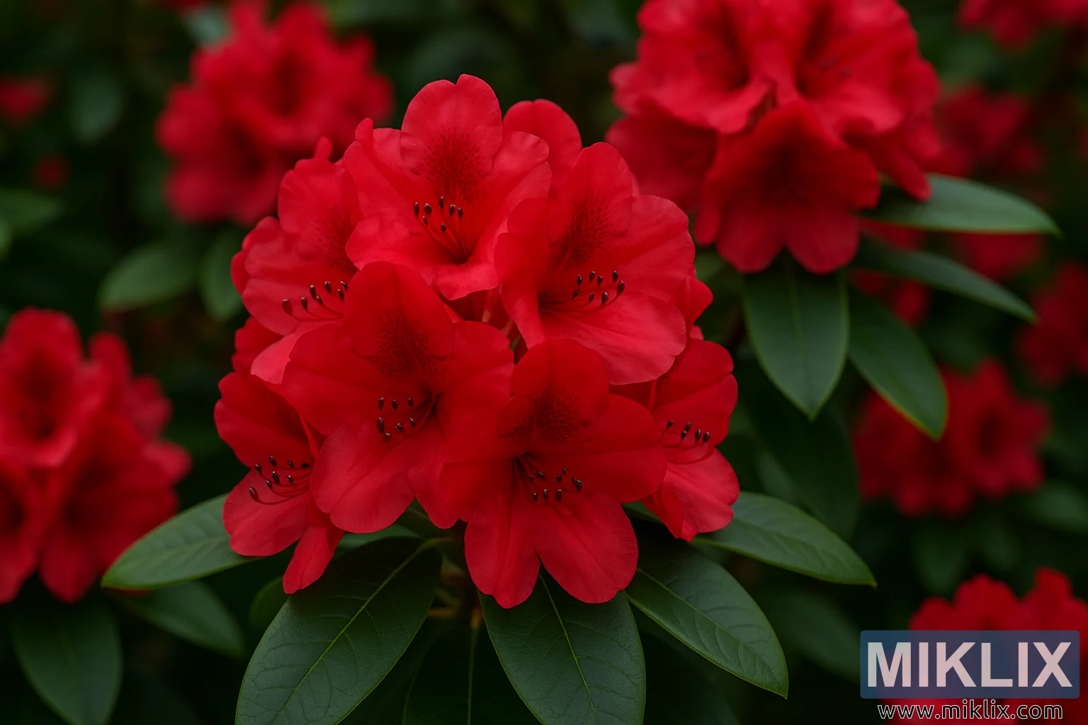 Fotografiet viser et intimt nærbilde av en Nova Zembla rhododendron, en av de mest ikoniske rødblomstrende kultivarene i sitt slag. Blomsterstanden dominerer bildet og springer ut i en tett klynge av trompetformede blomster, der hvert kronblad gløder med en dyp, fløyelsmyk karmosinrød fargetone. Blomstene virker nesten lysende, og intensiteten forsterkes av det omkringliggende, skinnende grønne bladverket som vugger blomsten som en levende ramme.