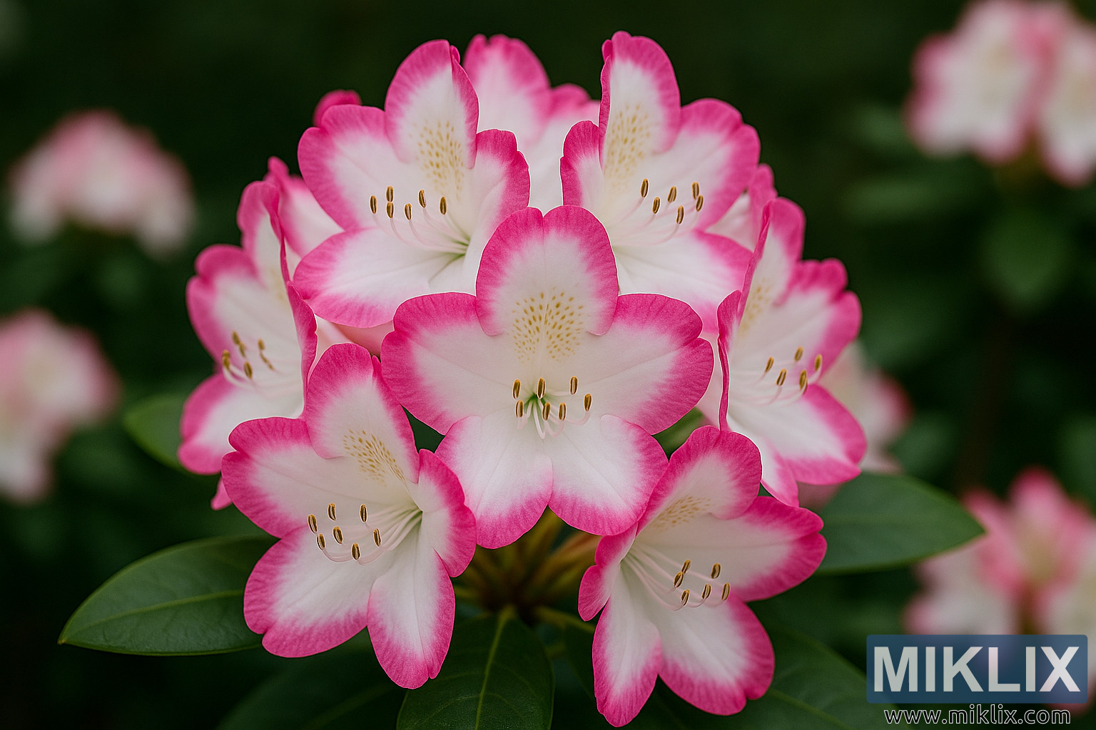 Et strålende nærbilde av Cherry Cheesecake-rhododendron, som viser tofargede hvite og rosa blomster med gylne fregner og blanke grønne blader.