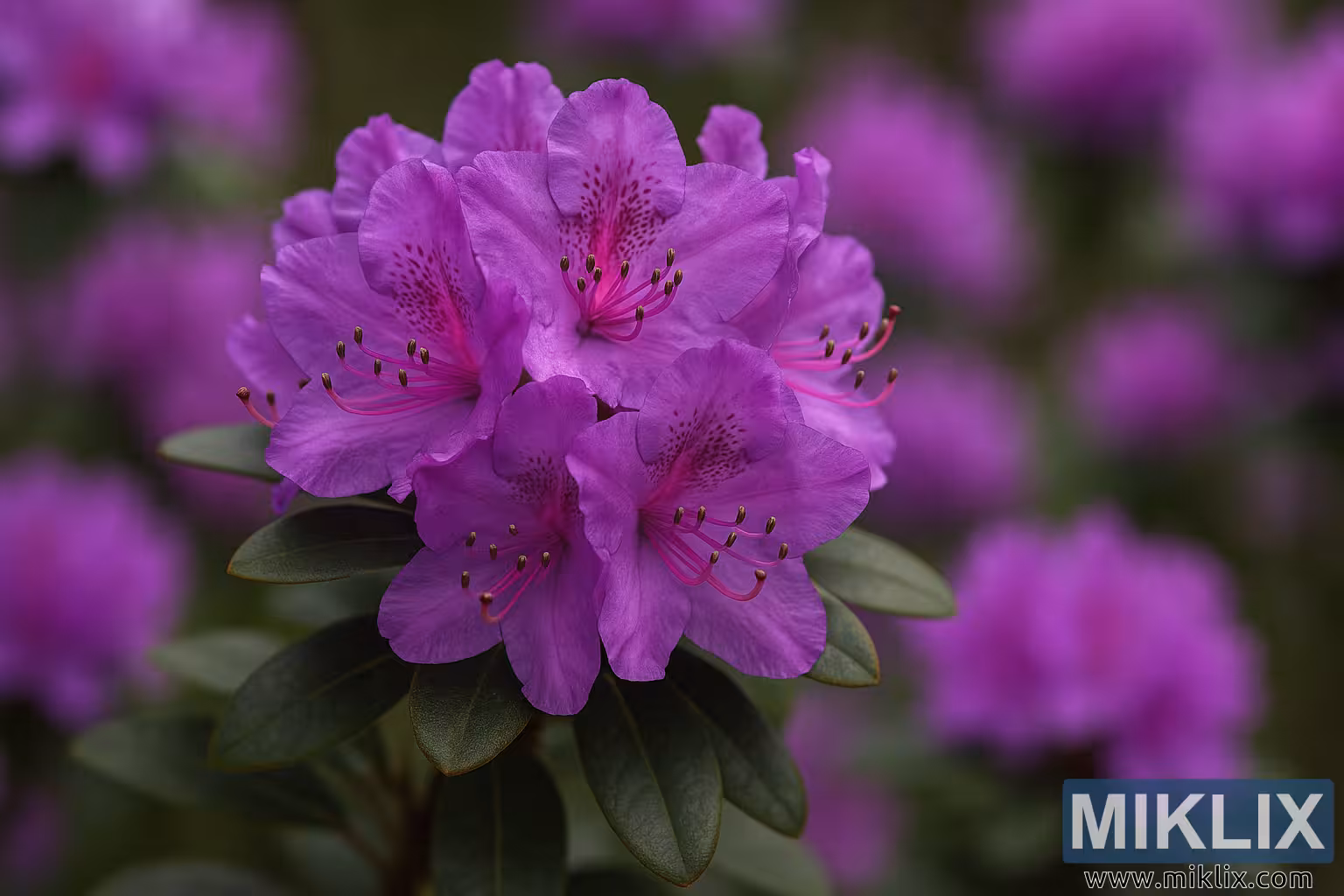 Blomsterklasen er innrammet av eviggrønt løvverk, noe som gir struktur og dybde til komposisjonen. Bladene er læraktige og elliptiske, mørkegrønne med subtile bronseundertoner, spesielt karakteristisk for PJM-hybrider. Den matte overflaten og robuste formen står i kontrast til blomstenes lysstyrke, noe som forankrer komposisjonen samtidig som den ytterligere fremhever blomstenes livlige fargerikdom.