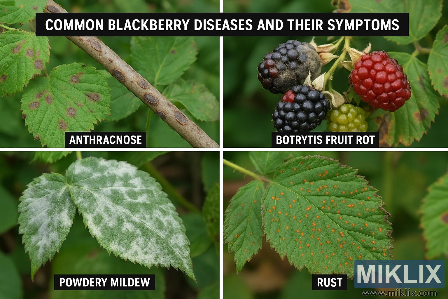 Høyoppløselig pedagogisk bilde som illustrerer vanlige bjørnebærsykdommer – antraknose, botrytis, meldugg og rust – og viser tydelige visuelle symptomer på berørte plantedeler.