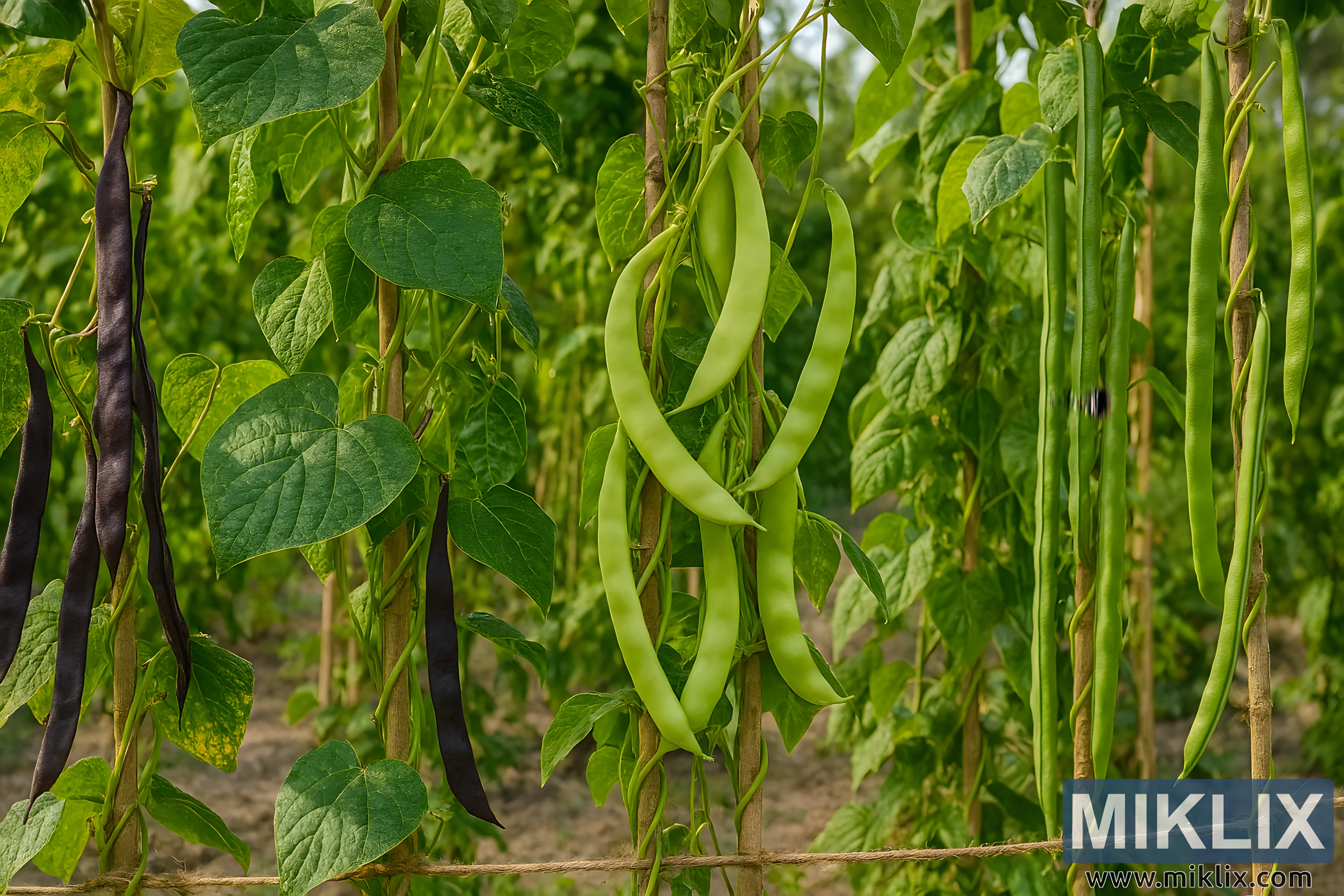 I forgrunnen er tre forskjellige varianter av bønnebelger tydelig vist frem. Til venstre henger mørkelilla bønner fra ranker med matte, lett buede belger. Disse bønnene står i skarp kontrast til det omkringliggende grøntområdet og gir visuell dybde. Rankene er sammenvevd med støttesnoren, og bladene er store, hjerteformede og teksturerte, og viser tegn på naturlig aldring med gule og brune flekker.