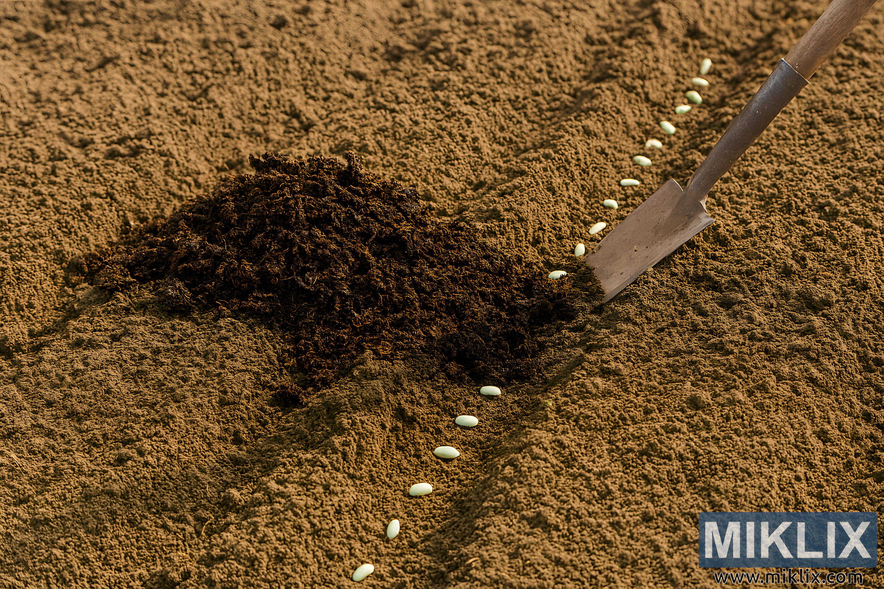 Høyoppløselig bilde som viser kompost blandet inn i godt forberedt hagejord med grønne bønne-frø plantet i en pen rad og en hagehakke i bruk.