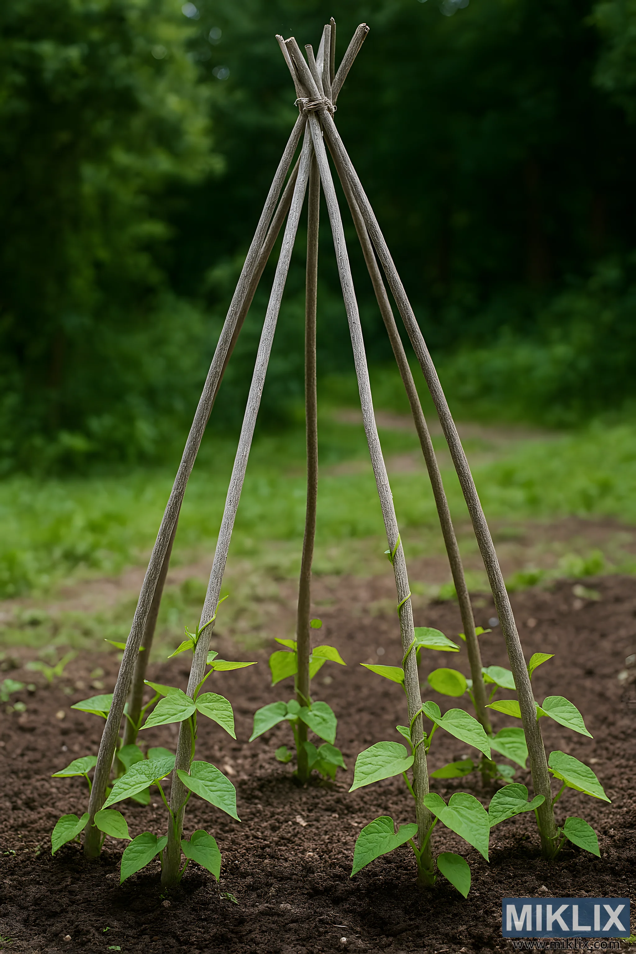 Høyoppløselig bilde av en bønnetipi med unge polbønneplanter som begynner å klatre i en frodig hage