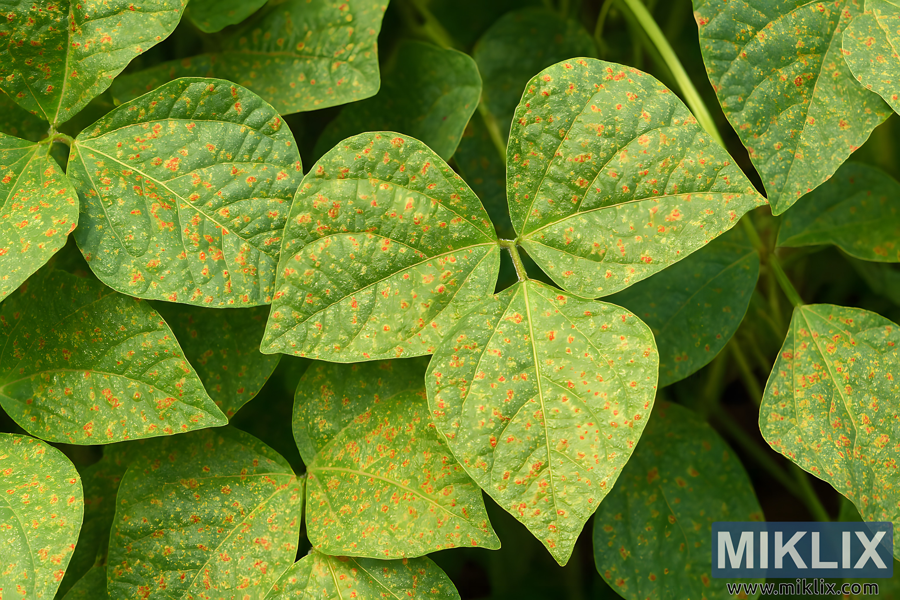 Høyoppløselig bilde som viser symptomer på bønnerust på grønne bønneblader, inkludert rødbrune pustler og klorotiske haloer.