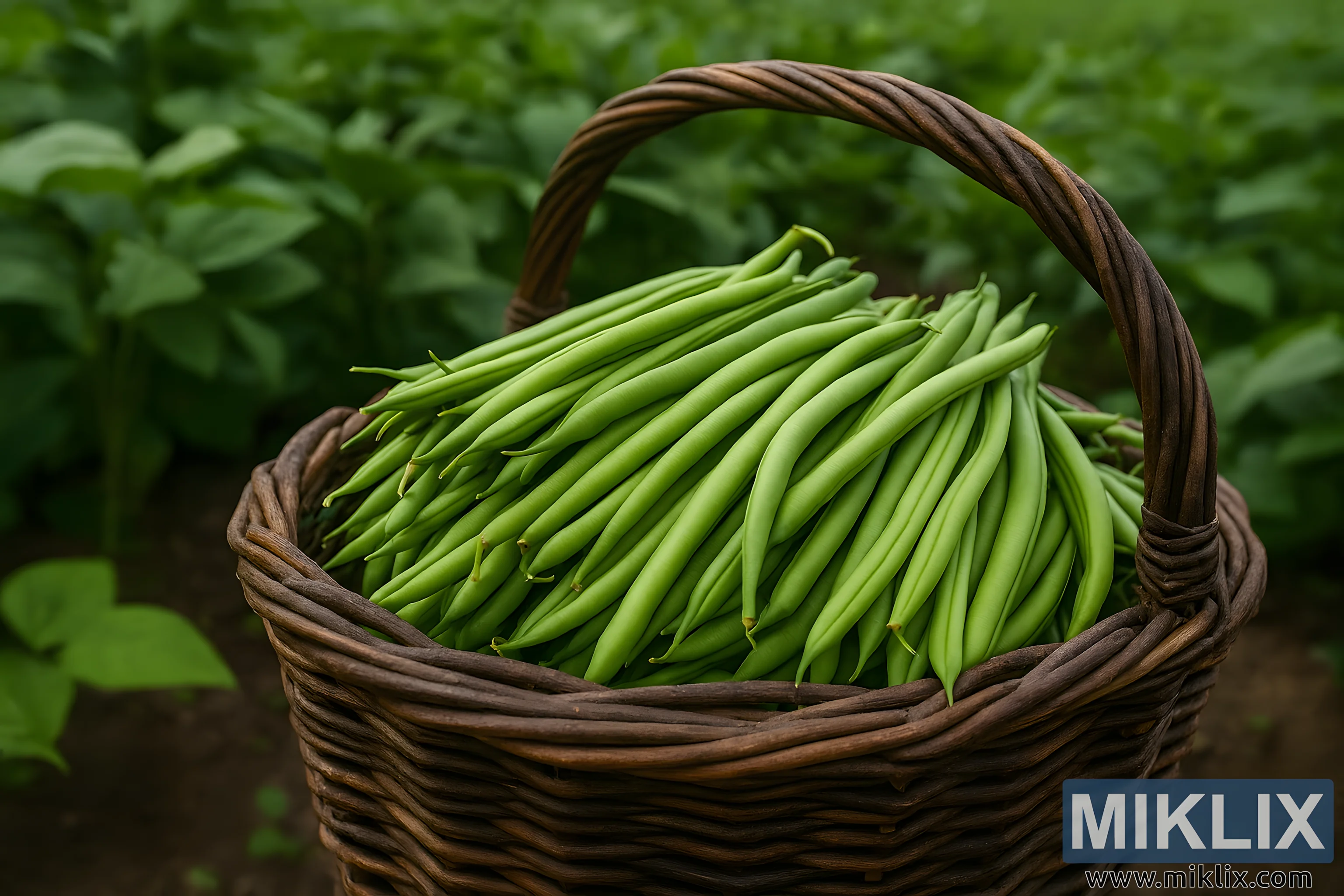 Høyoppløselig bilde av nyhøstede grønne bønner i en rustikk kurv, som viser frem ideell størrelse og kvalitet i et fargerikt hagefelt.