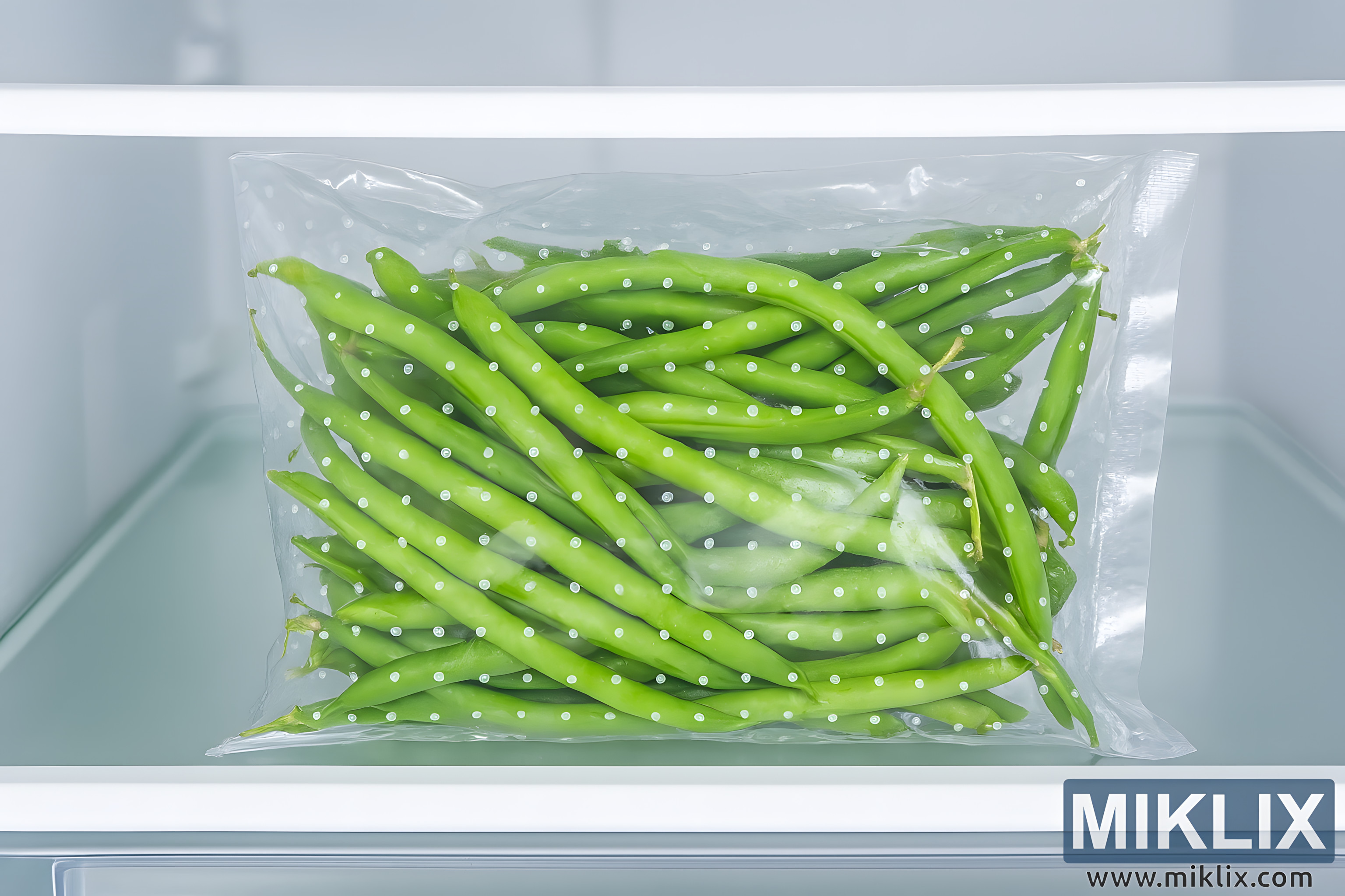 Høyoppløselig bilde av friske grønne bønner oppbevart i en perforert pose inne i et kjøleskap, som viser frem riktige teknikker for matkonservering.