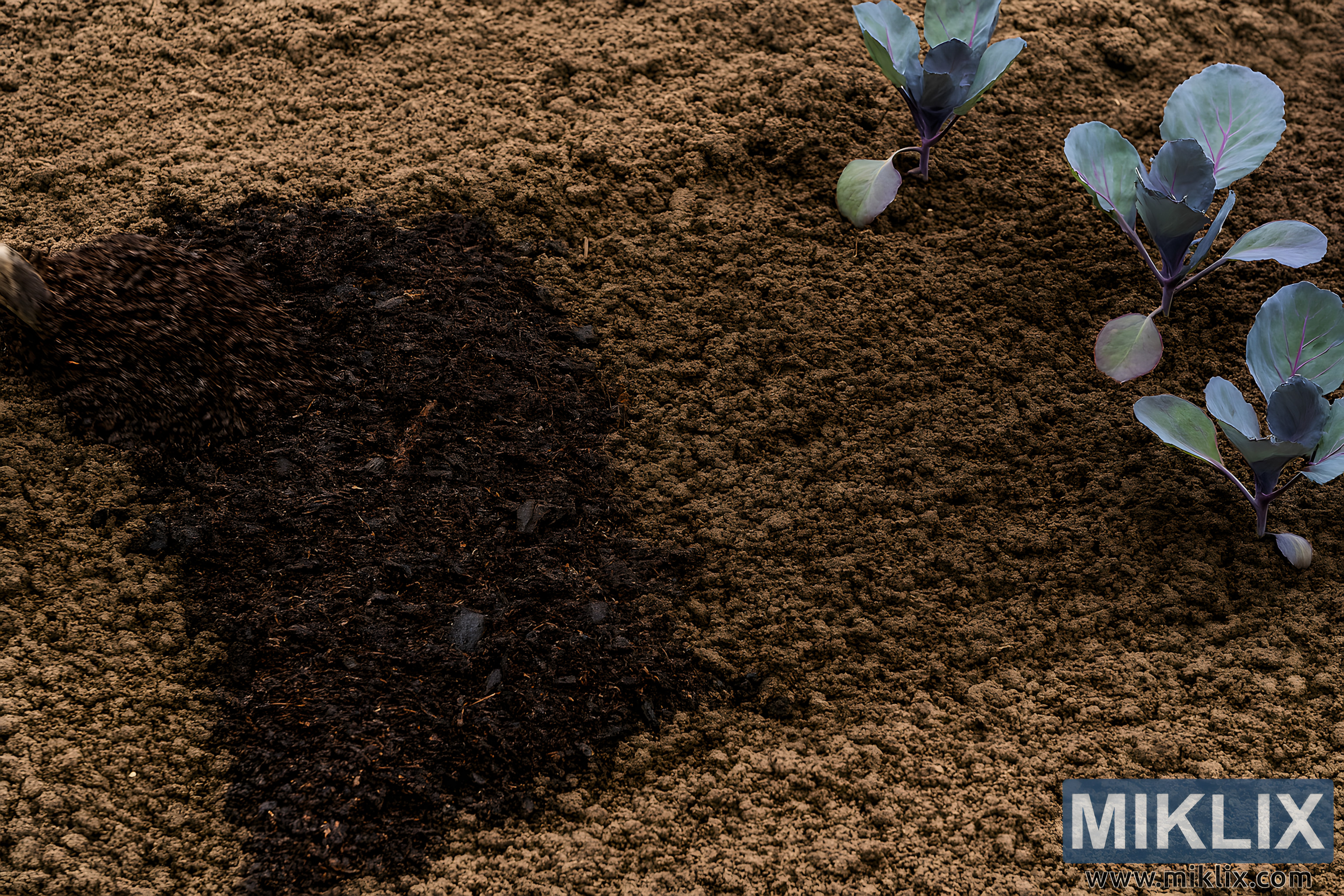 I den venstre-sentrale delen av bildet blir en mørk flekk med kompost blandet inn i jorden. Komposten er dyp brun til svart, med en smuldrende konsistens og synlige fragmenter av nedbrutt plantemateriale, inkludert kvister, bladmateriale og fiberholdige tråder. Dette organiske tilskuddet står i skarp kontrast til den omkringliggende jorden og fremhever dens rikdom og fruktbarhet. Komposten ser ut til å være nylig tilsatt, med noen områder fortsatt ublandet, noe som tyder på aktiv jordforbedring.