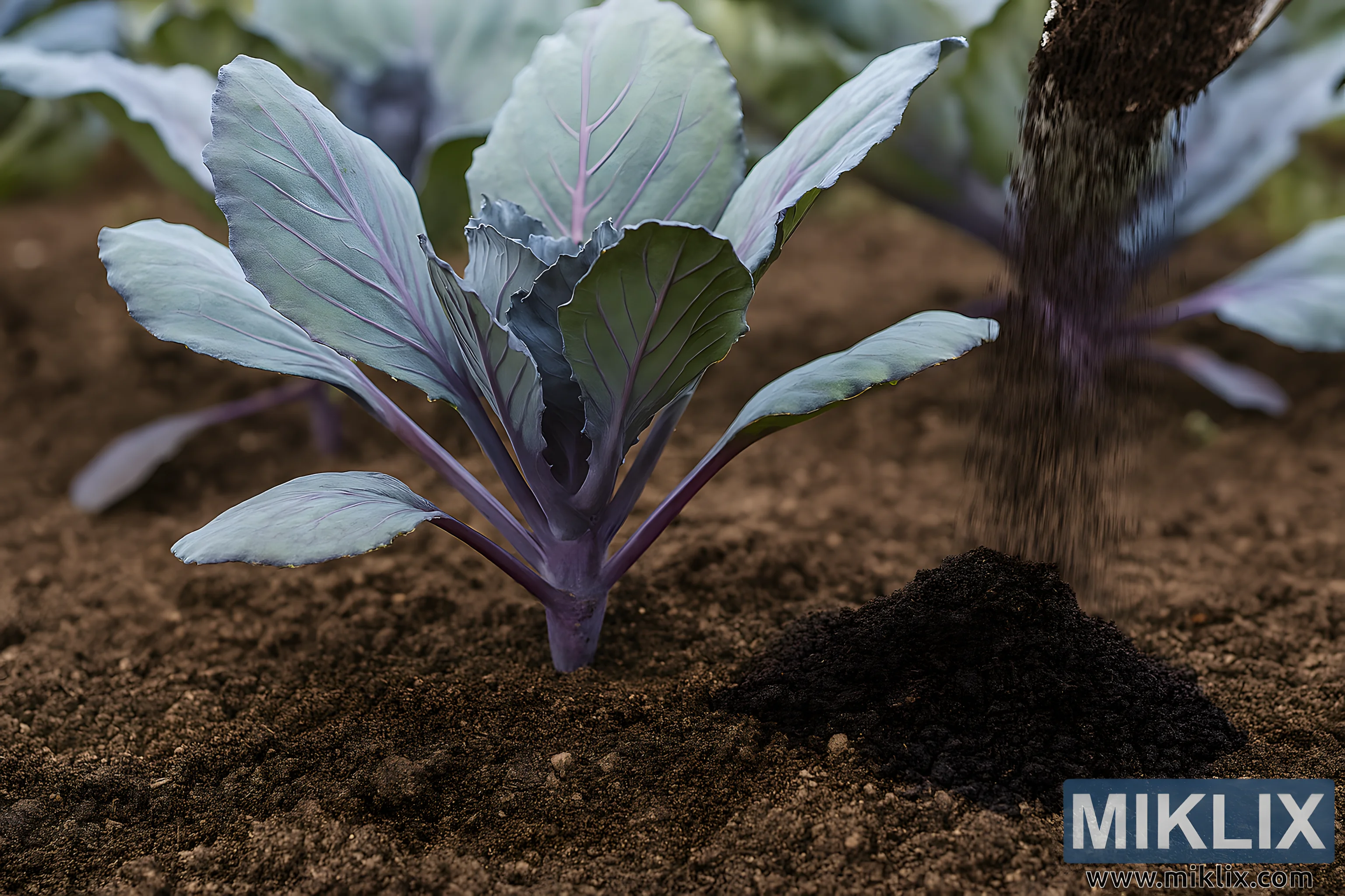 Høyoppløselig bilde som viser organisk gjødsel som påføres rundt rødkålplanter i en hage, med vekt på hagestell og jordberikelse.