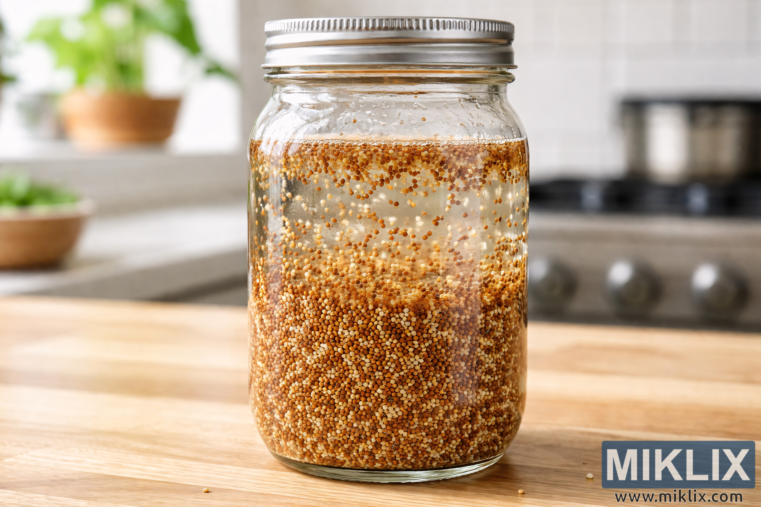 Høyoppløselig bilde av alfalfafrø bløtlagt i vann i et gjennomsiktig syltetøyglass, plassert på en benkeplate i tre med mykt naturlig lys og en uskarp kjøkkenbakgrunn.