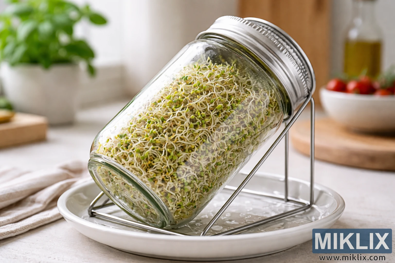 Bildet viser et klart glass, mason-krukke, tett fylt med friske alfalfaspirer, plassert i en bevisst vinkel for å la overflødig fuktighet renne av. Krukken er utstyrt med et metallnettlokk og står snudd på hodet på et minimalistisk stativ i rustfritt stål designet for spiring. Stativet hever krukken litt over en glatt hvit keramisk plate, hvor små vanndråper har samlet seg, noe som forsterker følelsen av nylig skylling og riktig drenering. Inne i krukken ser alfalfaspirene livlige og sunne ut, med bleke hvite stilker flettet sammen i et tett nettverk og små grønne blader som vokser frem, og skaper et teksturert, organisk mønster synlig gjennom det gjennomsiktige glasset. Mykt, naturlig lys lyser opp scenen fra siden, fremhever fuktigheten på glasset og den delikate strukturen til spirene, samtidig som det produserer milde refleksjoner på metalllokket og stativet. Bakgrunnen er bevisst uskarp, noe som antyder et rent, moderne kjøkkenmiljø. Subtile former og farger hinter til hverdagslige matretter, som en bladgrønn urteplante, en flaske gyllen olivenolje og en liten skål med røde cherrytomater som hviler på et skjærebrett i tre. Disse bakgrunnselementene gir varme og kontekst uten å trekke fokus bort fra krukken. Den overordnede komposisjonen føles rolig, frisk og bevisst, og legger vekt på hjemmelaget matlaging, bærekraft og sunn livsstil. Den nøytrale fargepaletten av hvitt, sølv og myke tretoner står i kontrast til de livlige grønne spirene, og skaper et balansert og visuelt tiltalende stilleben som formidler renslighet, enkelhet og friskhet.