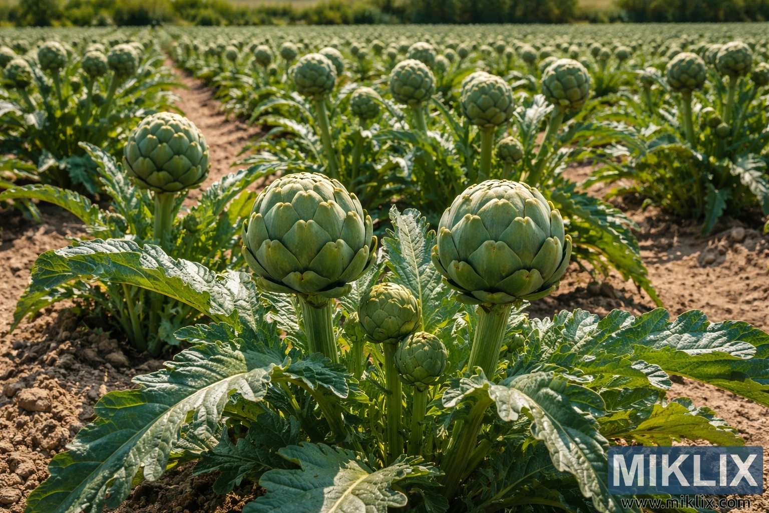 Høyoppløselig landskapsbilde av sunne artisjokkplanter som vokser i full sol, som viser modne knopper, brede blader og veldrenert jordbruksjord.