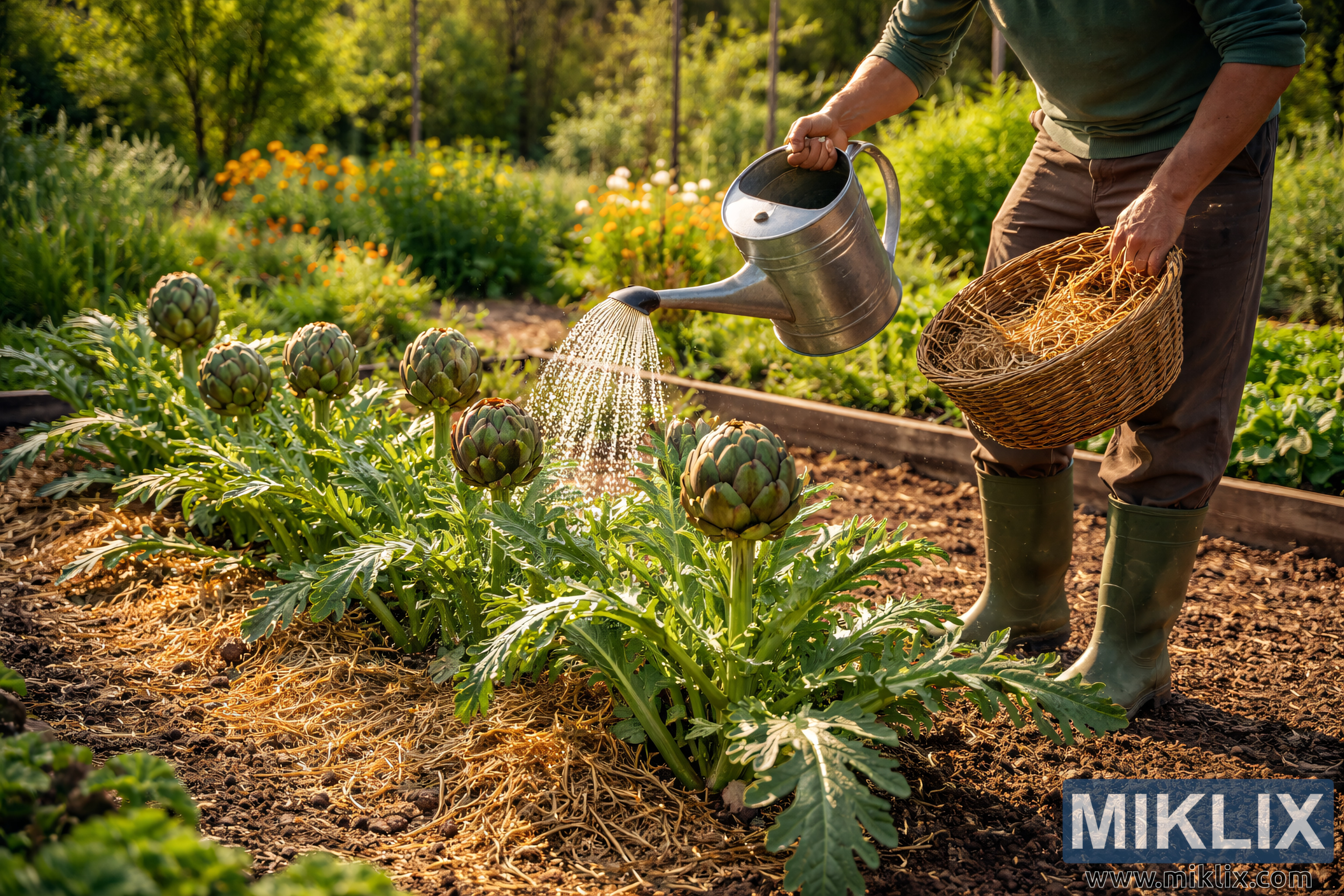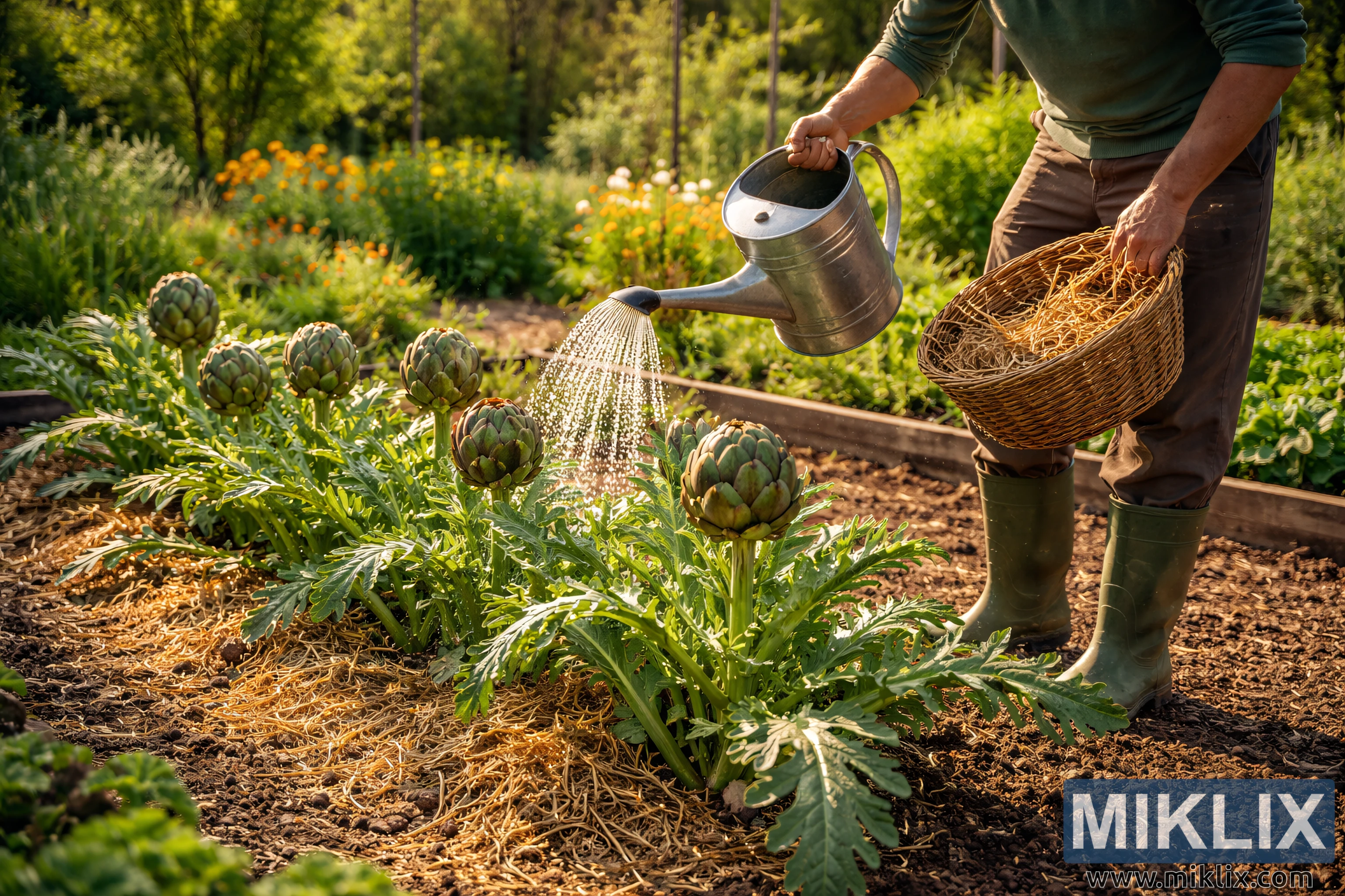 Høyoppløselig bilde av en gartner som vanner og dekker artisjokkplanter i en solfylt hage, med vekt på bærekraftig hagearbeid og sunne grønnsaker.