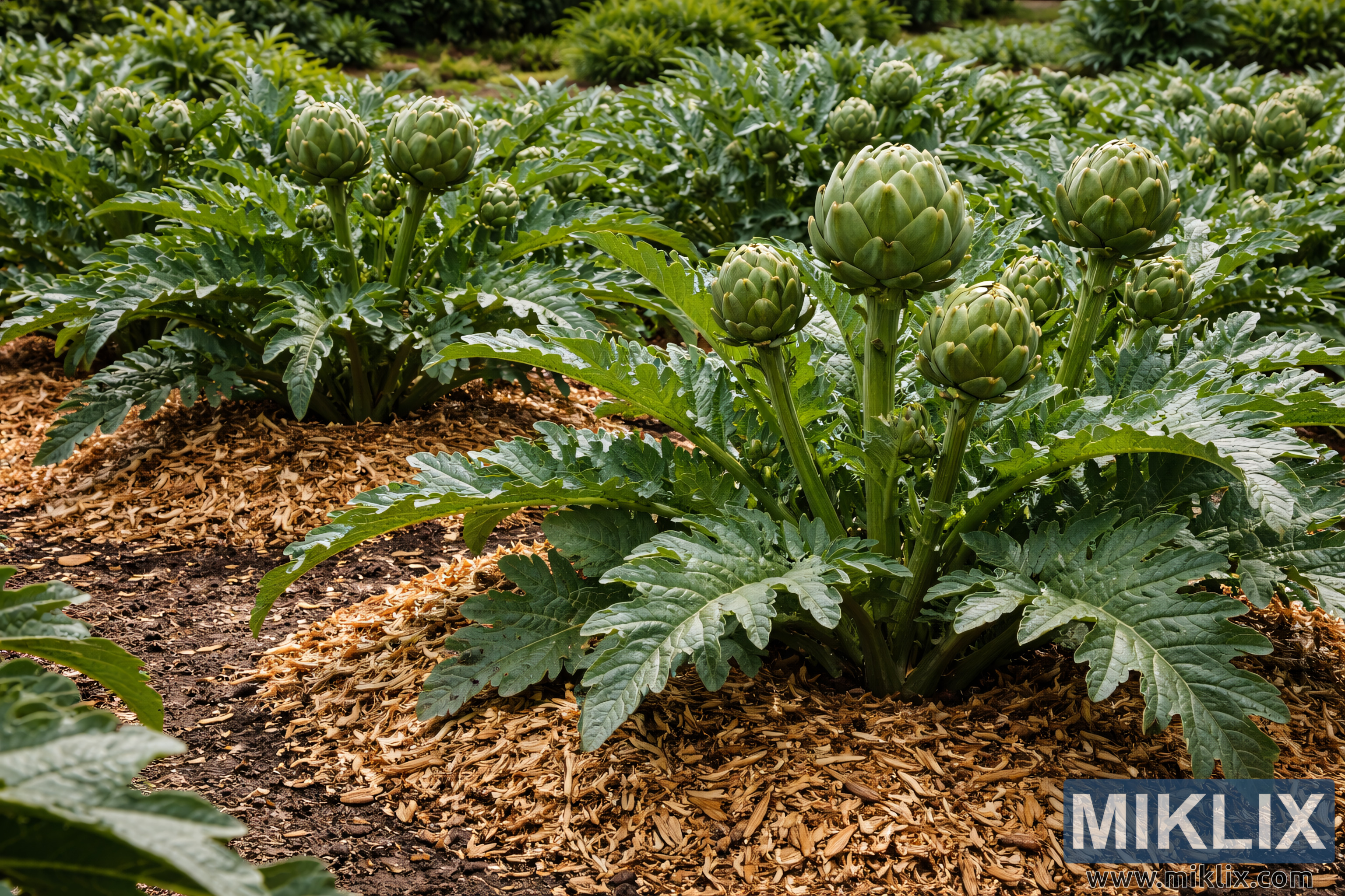 Landskapsfotografi av blomstrende artisjokkplanter med sølvgrønne blader og knopper i utvikling, som vokser i næringsrik jord og er omgitt av tykk organisk mulch.