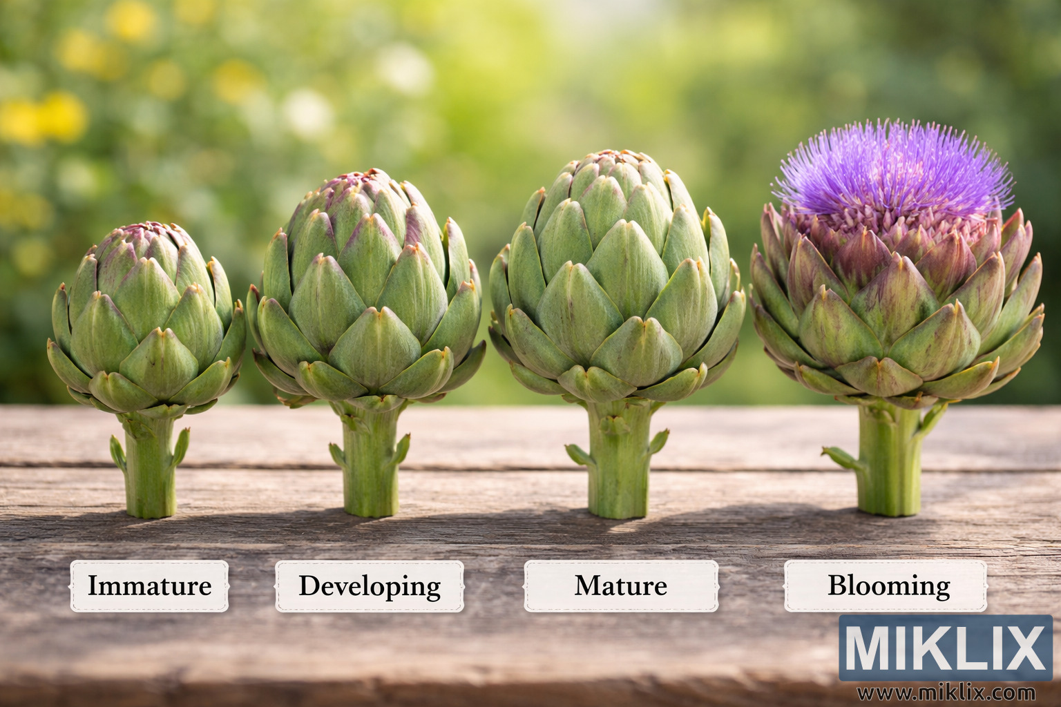 Den fjerde artisjokken helt til høyre er merket «Blomstrende» og står i sterk kontrast til de andre. De ytre bladene har åpnet seg vidt og avslører en livlig lilla blomst som kommer ut av midten. Fine, piggete filamenter stråler utover i et sirkulært mønster, noe som skaper en slående tekstur- og fargekontrast mot de grønne bladene nedenfor. Dette stadiet understreker plantens overgang fra spiselig knopp til blomstrende tistel.
