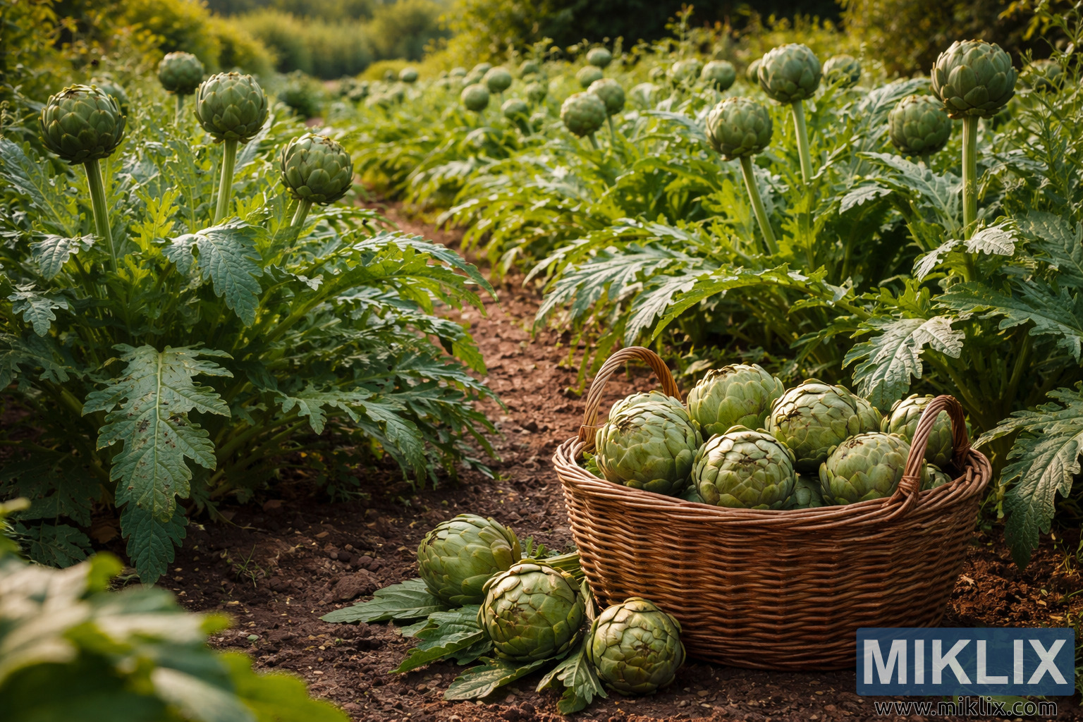 Bildet viser en fredfull og frodig artisjokkhage fanget i varmt, naturlig lys, noe som antyder sen ettermiddag eller tidlig kveld. Komposisjonen er bred og landskapsorientert, og viser flere rader med modne artisjokkplanter som strekker seg inn i bakgrunnen. Hver plante er fyldig og sunn, med store, dypt flikete, sølvgrønne blader som sprer seg utover nær jorden. Over løvverket stiger robuste stilker toppet med fyldige, tett lagdelte artisjokkknopper i varierende modenhetsstadier, deres grønne overflater er subtilt farget med lilla nyanser. Hagerekkene er atskilt av en smal jordsti av rik brun jord, litt ujevn og teksturert, som leder betrakterens øye dypere inn i scenen. I forgrunnen, plassert fremtredende på stien, står en rustikk flettet kurv vevd av lysebrunt siv. Kurven er fylt til randen med nyhøstede artisjokker, deres kompakte former og overlappende skjell er tydelig synlige og gjengitt med fine detaljer. Noen få ekstra artisjokker hviler ved siden av kurven på jorden, noe som forsterker følelsen av en nylig innhøsting. Bakgrunnen falmer forsiktig inn i mykere fokus, med flere artisjokkplanter og frodig grøntområde som skaper dybde uten å distrahere fra hovedmotivet. Belysningen fremhever de naturlige teksturene – de matte bladene, de faste knoppene og den grove veven i kurven – samtidig som den kaster myke skygger som gir dimensjon. Alt i alt formidler bildet en følelse av produktivitet, ro og tilknytning til landet, og feirer sesongens innhøsting og skjønnheten i en velstelt grønnsakshage.