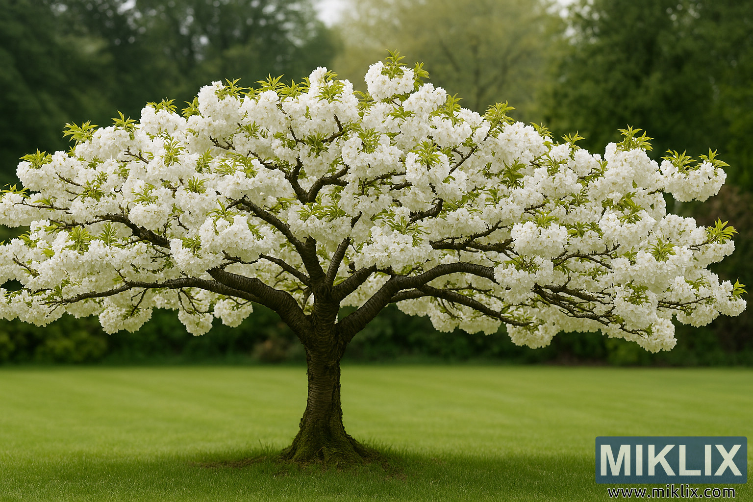 Bildet viser et fantastisk kirsebærtre fra Fuji-fjellet (Prunus 'Shirotae') i full vårblomstring, presentert i ultrahøy oppløsning og landskapsformat. Treet står alene på en uberørt, smaragdgrønn plen, formen er symmetrisk og skulpturell, og fremkaller både botanisk presisjon og naturlig ynde. Stammen er kraftig og strukturert, med en robust, mørkebrun bark som vrir seg oppover før den viker for en bred, horisontalt spredt krone. Denne kronen er det definerende trekket ved kultivaren – bred, flat og elegant lagdelt, med grener som strekker seg sidelengs i et grasiøst, nesten arkitektonisk løft.