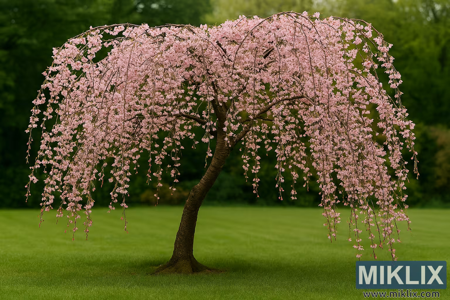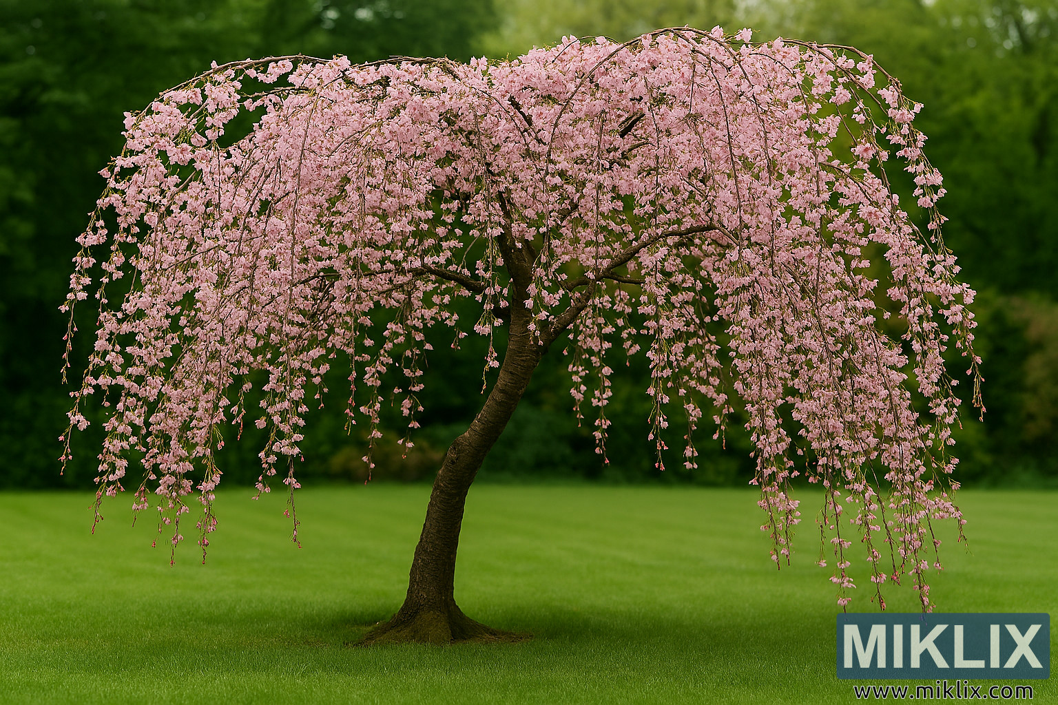 Under treet er plenen livlig grønn, nyklippet og jevn i teksturen. Gresset rett under trekronene er litt mørkere, i skyggen av det tette blomsterteppet over. I bakgrunnen danner en rekke løvfellende trær og busker en naturlig ramme for kirsebærtreet. Bladverket deres varierer fra dyp skoggrønt til lys vårlime, og bakgrunnen er mykt uskarp for å holde fokus på det gråtende kirsebærtreet.