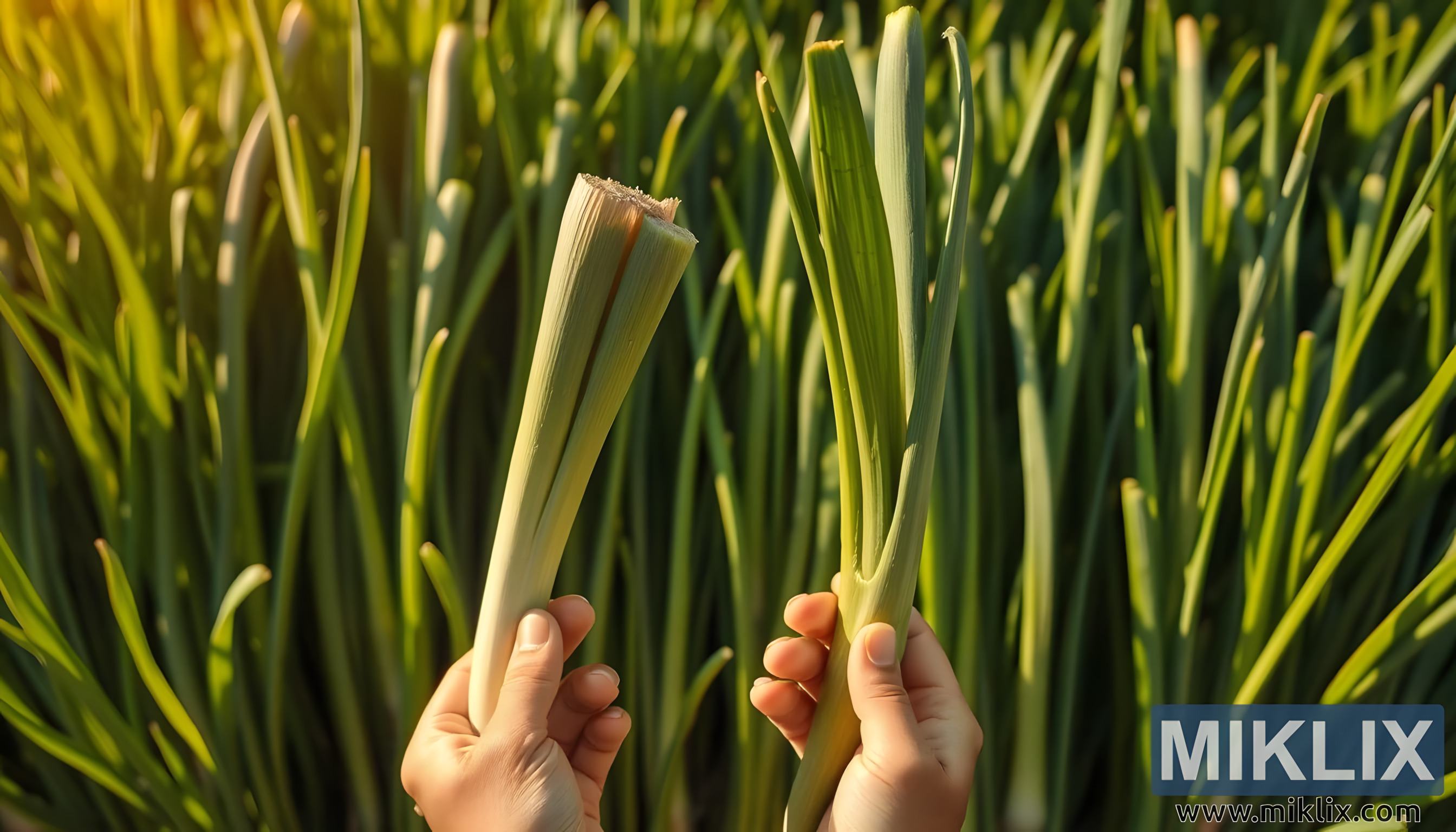 Nyhøstet purre holdt i hånden under varmt sollys med frodig grønt, som symboliserer vitalitet, helse og deres naturlige vekttapsfordeler.