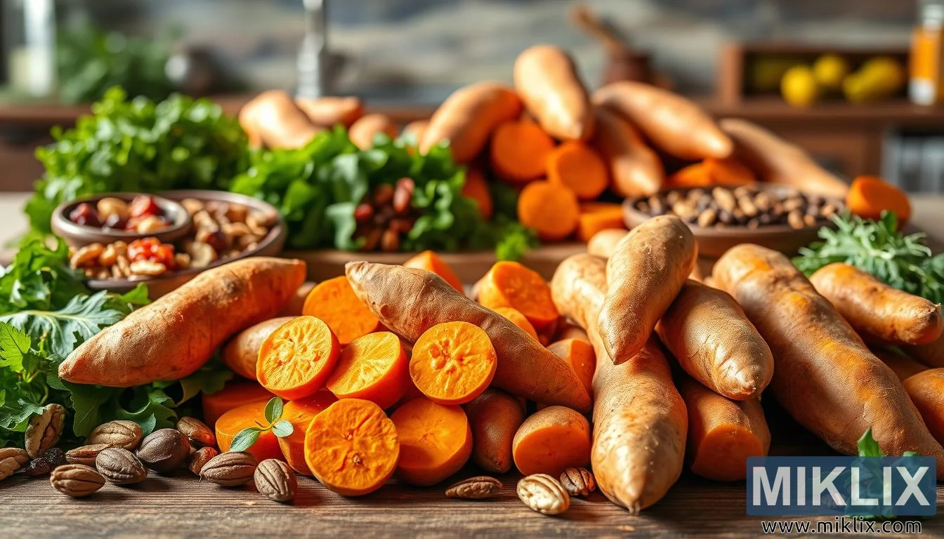 Levende visning av søtpoteter med greener, nøtter og tørket frukt på et rustikk bord, og fremhever deres rike farge, ernæring og helsemessige fordeler.