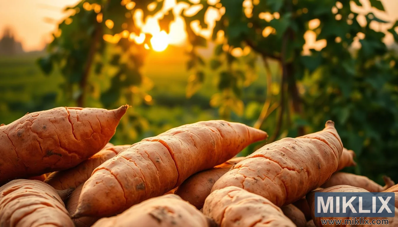Livlige søtpoteter med frodige grønne vinstokker og et gyllent bakteppe, som fremhever deres naturlige skjønnhet, næring og hjemmedyrkede overflod.