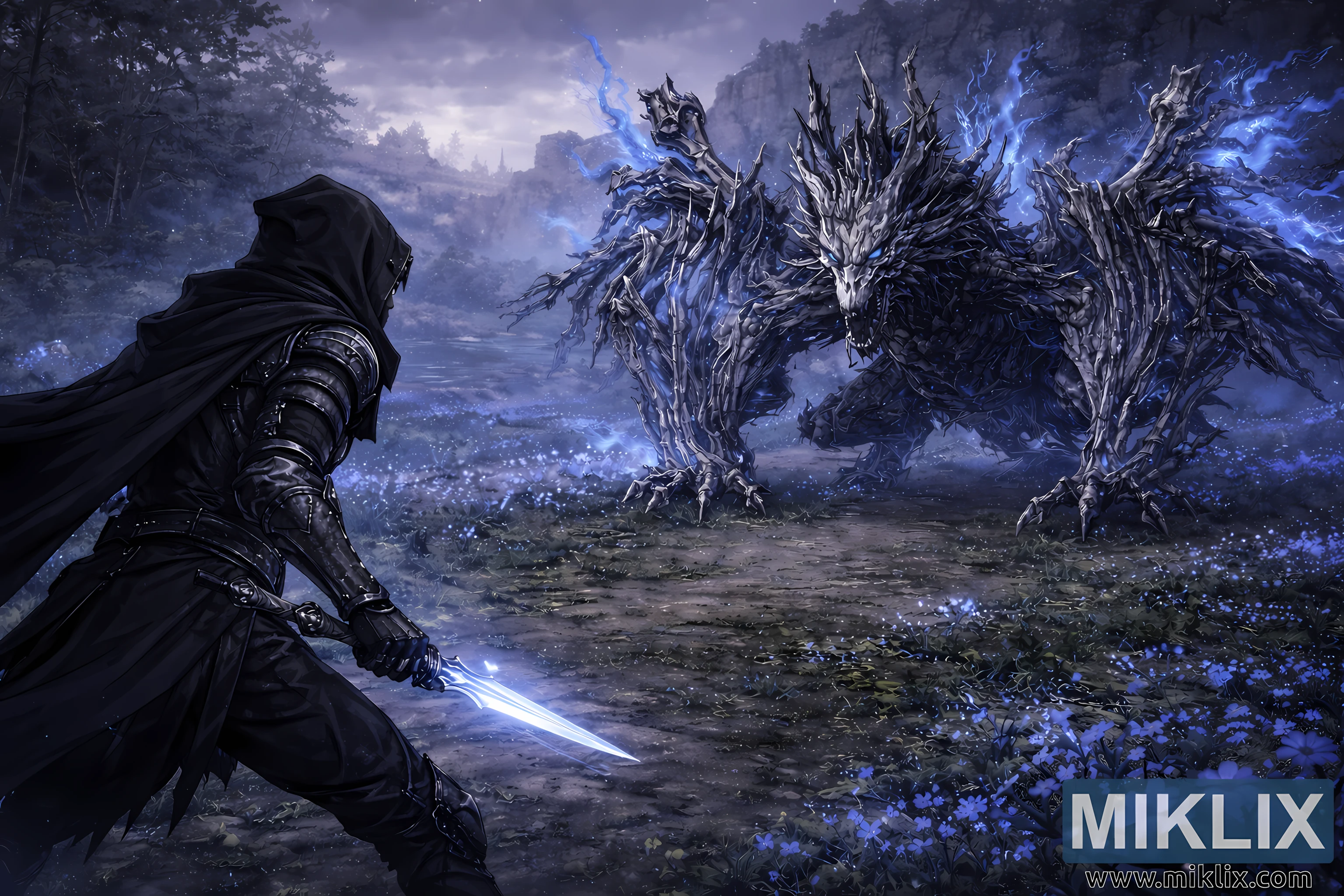 Den omkringliggende Ceruleankysten er gjennomsyret av kalde farger og tung atmosfære. En tåkete kystlinje strekker seg ut i det fjerne, flankert av sparsomme, mørke trær og taggete klipper som forsvinner i en blågrå dis. Bakken mellom krigeren og monsteret er dekket av små, lysende blå blomster, deres milde glød danner en skjør, nesten hellig sti som fører rett inn i farens gap. Spøkelsesflammegløder driver gjennom luften som fallende stjerner frosset i tid og binder de to figurene sammen over det spente gapet. Til tross for stillheten summer bildet av latent bevegelse: den Anløptes strammende grep, dragens sammenkrøllede muskler og den skjelvende stillheten til en verden som holder pusten. Det er ennå ikke kamp, men øyeblikket foran det, når besluttsomhet og terror møtes og fiendens omfang blir ubestridelig.