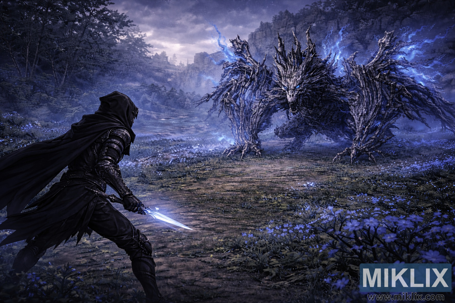 Den bredere bakgrunnen beriker atmosfæren. Den blå himmelkysten strekker seg i det fjerne, med tåke som tilslører en rekke mørke trær til venstre og bratte, værbitte klipper som reiser seg bak dragen. Dammer med stille vann reflekterer den svake, overskyede himmelen, mens svake ruiner og steinete utspring falmer inn i den blågrå disen. Hele scenen er badet i kalde toner, kun punktert av den spektrale gløden fra den anløpne dolken og dragens spøkelsesflamme. Mellom de to figurene dekker små blå blomster bakken, deres myke lysstyrke danner en skjør, nesten hellig korridor gjennom den forestående volden. Spøkelsesflammegløder svever dovent gjennom luften og syr visuelt sammen kriger og monster over det spente gapet som skiller dem.