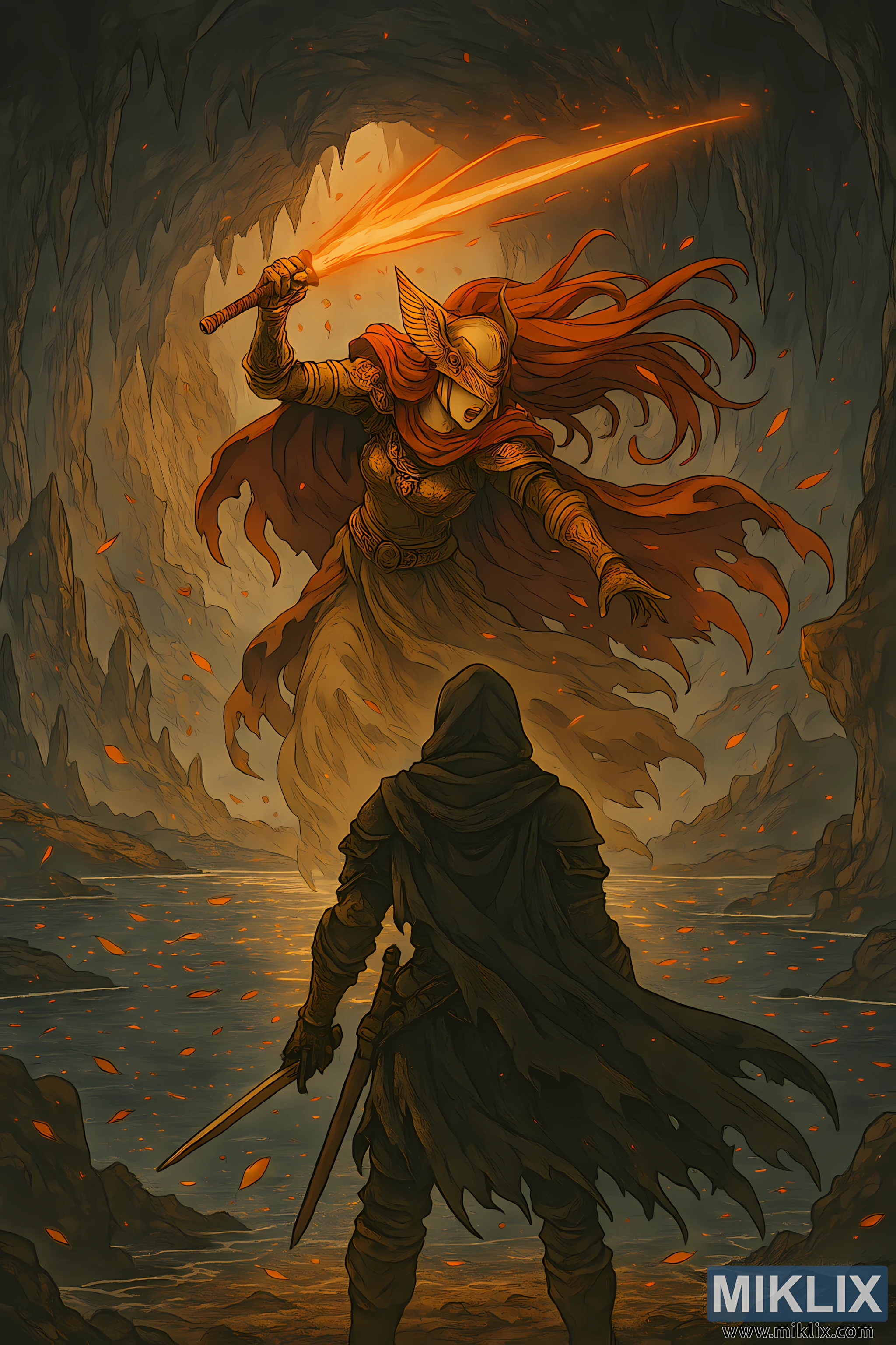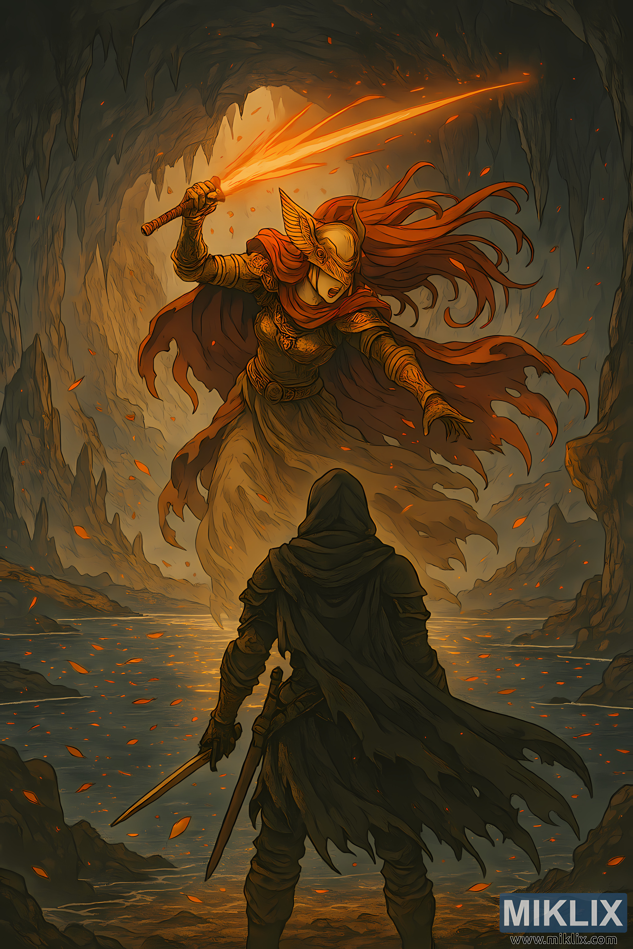 Denne illustrasjonen forvandler en brutal bosskamp til et øyeblikk av mytisk historiefortelling, og fanger høytideligheten i handlingen, storheten i settingen og uunngåeligheten i sammenstøtet. Det er en hyllest til Elden Rings visuelle poesi og den emosjonelle tyngden av dens mest legendariske duell.