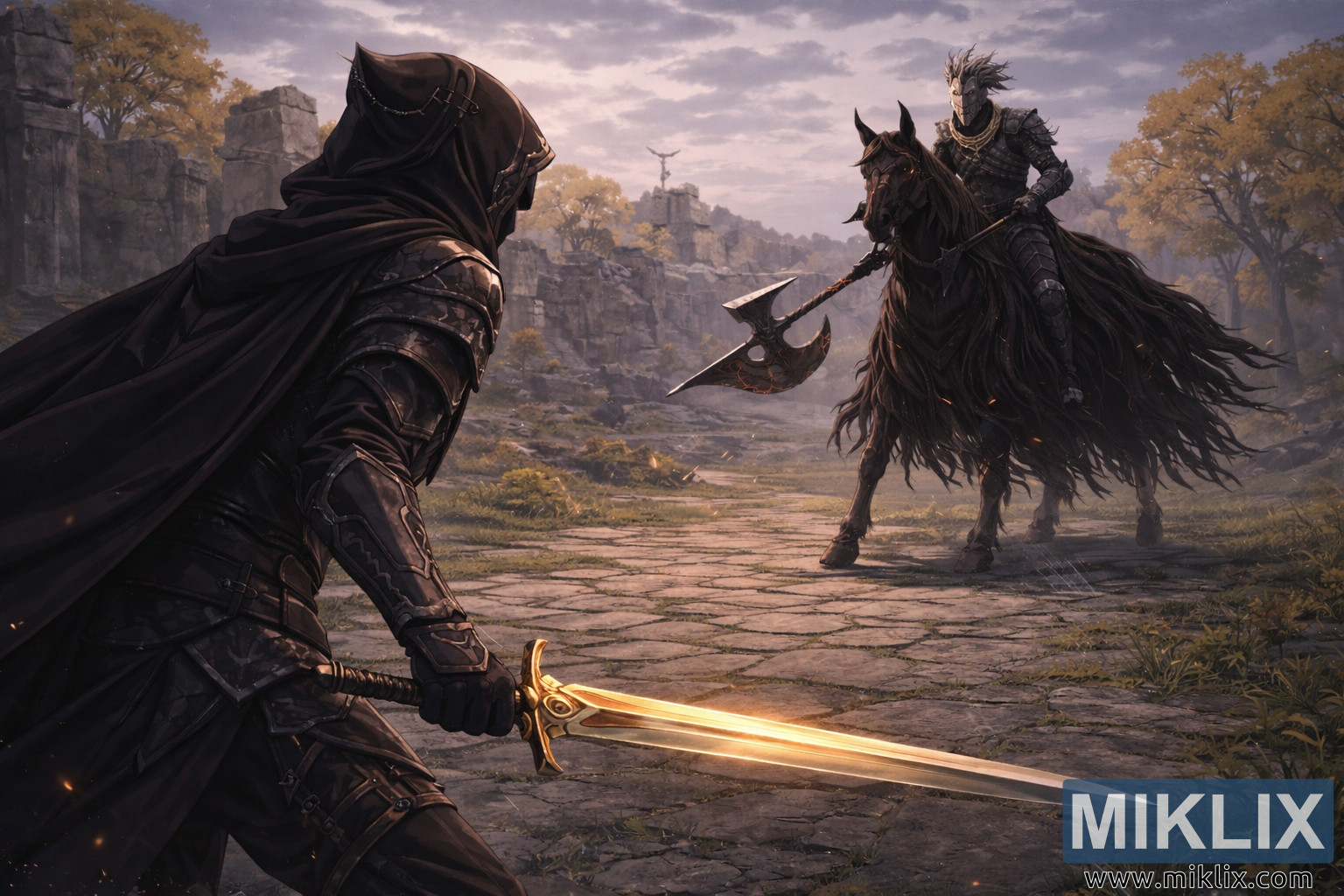 På den sprukne steinveien midt i bakken står det imponerende Night's Cavalry, ridende på en massiv svart hest. Rytterens rustning er tykk, kantete og kampmerket, med mørke jernplater lagvis over kroppen. Subtile, glørlignende gløder blafrer fra leddene og kantene på rustningen, noe som antyder overnaturlig energi inni. Ridderen griper en stor hellebard diagonalt over torsoen, det buede bladet reflekterer matt oransje lys som visuelt gjenspeiler den anløpnes glødende sverd. Hesten under rytteren virker kraftig og rastløs, den lange manen flyter som blekk i vinden og er dekket av svake, flammende gnister. Til tross for avstanden mellom dem, er begge figurene låst i stille bevissthet, deres stillinger anspente og overveide, og fanger det skjøre hjerteslaget før kampen bryter ut.