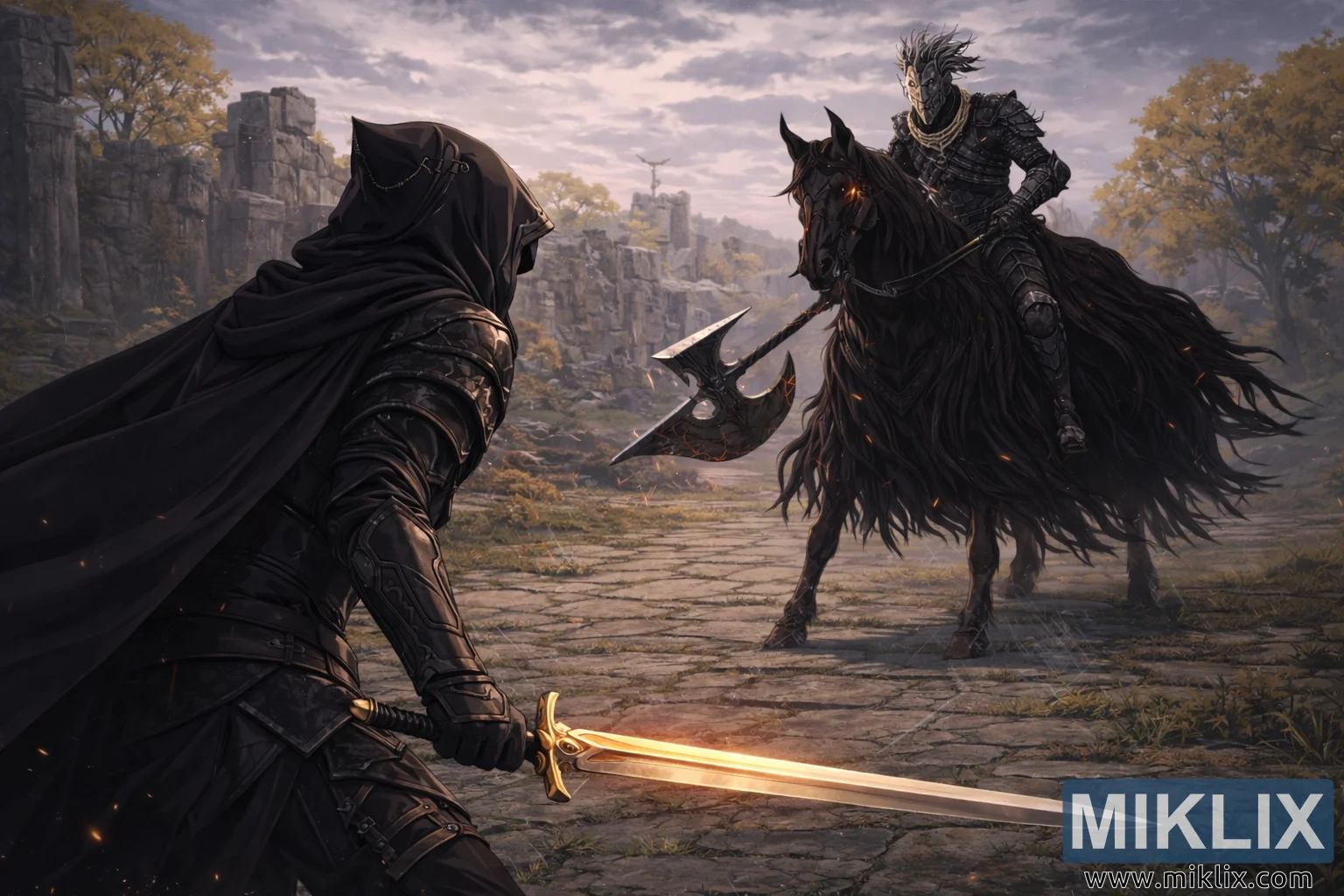 Det omkringliggende landskapet forsterker den filmatiske atmosfæren og den narrative spenningen. Gamle ruiner strekker seg over horisonten – sammenraste buer, ødelagte tårn og værbitte steinmurer delvis gjenvunnet av krypende lianer og moseflekker. Gyldne høsttrær rammer inn scenen, deres varme løvverk gir en mild kontrast til de kalde steinstrukturene og den overskyede himmelen. Bakken består av oppsprukket belegningsstein vevd sammen med gresstuster og spredte glødende glør som driver dovent gjennom luften, noe som antyder dvelende magi eller rester av tidligere konflikt. En grunn dybdeskarphet myker opp fjerne elementer og leder betrakterens fokus mot konfrontasjonen mellom de to figurene. Diffust skumringsbelysning dekker terrenget i en blek belysning samtidig som det lar de glødende sverd- og glørgnistene skille seg ut levende. Den overordnede fargekomposisjonen blander dype svarttoner, kjølige gråtoner og dempede blåtoner med nøye plasserte varme høydepunkter, noe som produserer et rikt teksturert tablå som fanger den nøyaktige hjerterytmen før kampen – et bilde definert av forventning, ubalanse i skala og dramatisk visuell historiefortelling gjengitt i polert anime-estetikk.