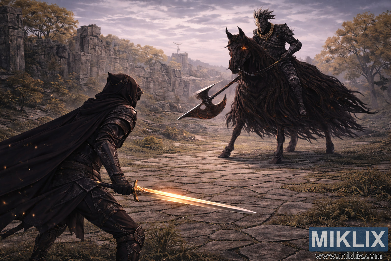 Den utvidede komposisjonen avslører en bred strekning av de omkringliggende ruinene og slettene, noe som forsterker den filmatiske atmosfæren. Gamle steinstrukturer kanter horisonten – kollapsede tårn, oppsprukkede vegger og smuldrende buer delvis gjenvunnet av krypende lianer og moseflekker. Gyldne høsttrær rammer inn scenen på begge sider, deres varme løvverk står i forsiktig kontrast til den kalde steinen og den overskyede himmelen. Bakken består av sprukne belegningsstein vevd sammen med gresstuster og spredte glødende glør som driver dovent gjennom luften, og hinter til dvelende magi eller ettervirkningene av tidligere konflikter. Bølgende åser og fjerne klippeflater falmer inn i en disig bakgrunn, forsterket av en grunn dybdeskarphet som opprettholder fokus på den sentrale konfrontasjonen samtidig som den fremhever miljømessig skala. Diffust skumringslys dekker terrenget i et blekt lys, slik at de glødende sverd- og glørgnistene kan skille seg ut levende. Den overordnede fargepaletten blander dype svarttoner, kalde gråtoner og umettede blåtoner med nøye plasserte varme høydepunkter, noe som resulterer i et rikt teksturert tablå som fanger den presise hjerterytmen før kampen – et bilde definert av forventning, ubalanse i skala og ekspansiv visuell historiefortelling gjengitt i polert anime-estetikk.