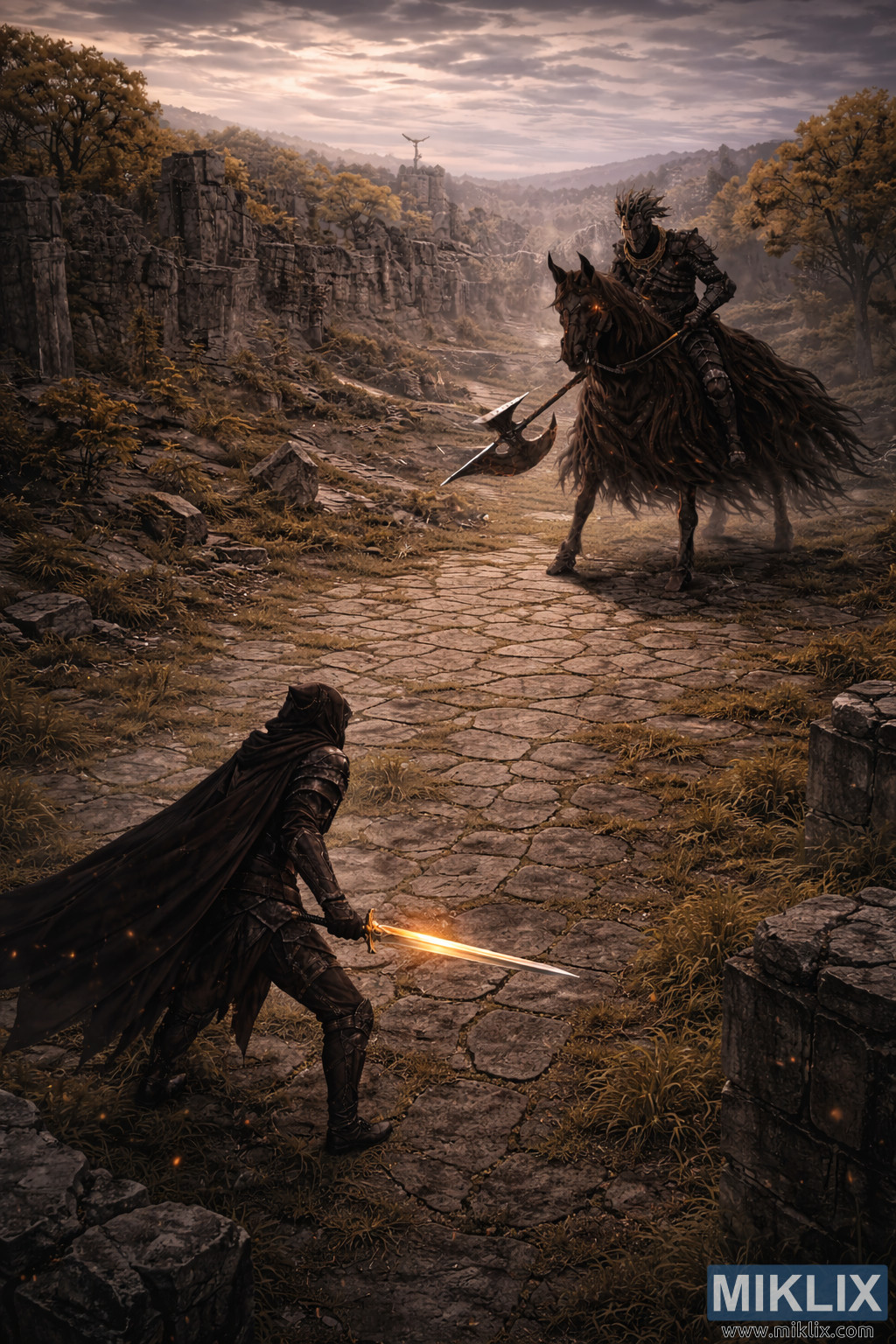 Den forhøyede kameravinkelen avslører et vidstrakt miljø som forsterker den filmatiske atmosfæren og skalafølelsen. En svingete steinvei skjærer gjennom gamle ruiner og bølgende terreng, og leder øyet fra forgrunnskonfrontasjonen mot fjerne klipper og disige åser. Smuldrende steinmurer, oppsprukkede søyler og kollapsede buer kanter stien, delvis gjenvunnet av krypende lianer, mose og klynger av høstgress. Gyllenbladede trær rammer inn midtpunktet, deres varme løvverk myknet av diffust skumringslys som filtrerer gjennom lagdelte skyer over hodet. Himmelen er malt i dempede lilla, grå og blek ravfarger, noe som antyder at dagens siste lys forsvinner ut i kveld. Spredte glør driver sakte over scenen, og tilfører bevegelse og en svak magisk undertone uten å overdøve realismen. En grunn atmosfærisk dis myker opp fjerne detaljer, forsterker dybden samtidig som den opprettholder klarheten rundt de to sentrale figurene. Den overordnede paletten balanserer jordbrune, dype svarte, kalde grå og umettede blåtoner med nøye plasserte varme høydepunkter fra sverdgløden og glørgnistene. Resultatet er et visuelt forankret, men likevel fantastisk tablå som fanger forventning, maktubalanse og miljømessig storhet innenfor en semi-realistisk mørk fantasi-estetikk.
