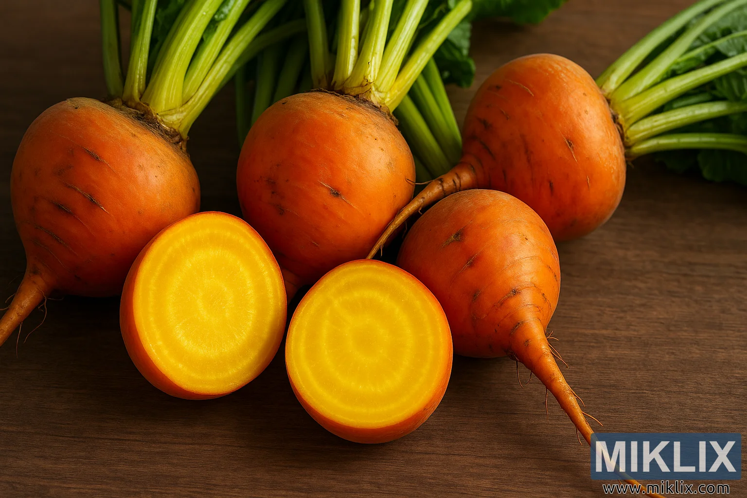 काठको सतहमा सुनौलो-सुन्तला रंगको छाला र चम्किलो पहेंलो भित्री भाग प्रदर्शन गर्ने गोल्डेन ब्वाय चुकन्दरको विस्तृत तस्बिर।