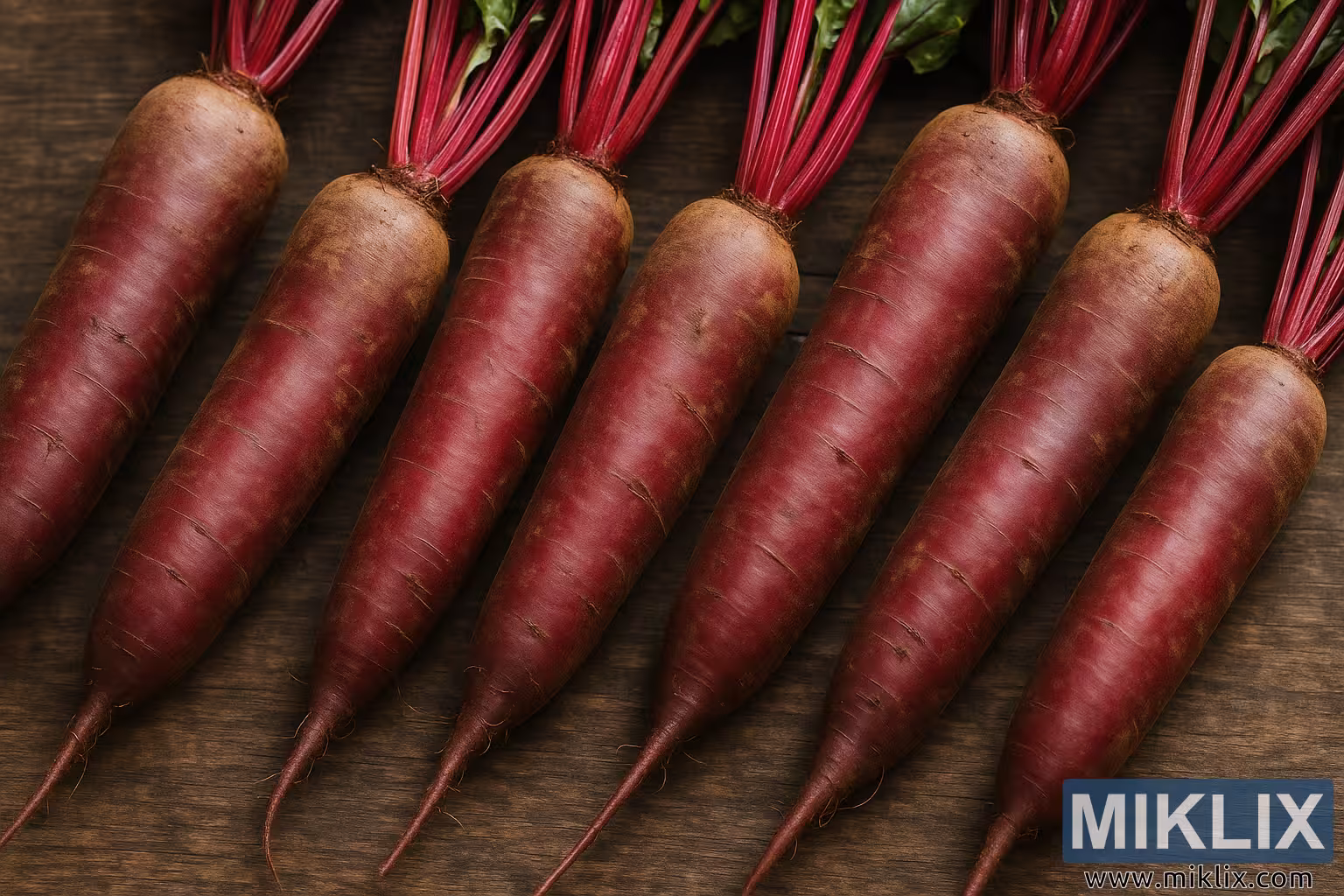 यो उच्च-रिजोल्युसन ल्याण्डस्केप तस्बिरले सिलिन्ड्रा चुकन्दरको सावधानीपूर्वक व्यवस्थित पङ्क्ति प्रस्तुत गर्दछ, जुन तिनीहरूको विशेषता लामो, बेलनाकार आकारको लागि प्रसिद्ध छ। चुकन्दरहरू देहाती काठको सतहमा तेर्सो रूपमा लाइन गरिएका छन्, प्रत्येक तरकारी अन्यसँग समानान्तर राखिएको छ जसको पातलो जराको छेउ तलतिर औंल्याइएको छ र यसको पातदार डाँठहरू माथितिर फैलिएको छ। तिनीहरूको छालाले गहिरो बरगंडी-रातो रंग प्रदर्शन गर्दछ जसमा स्वरमा सूक्ष्म भिन्नताहरू छन्, लगभग बैजनी देखि न्यानो रातो-खैरो सम्म, प्रत्येक चुकन्दरलाई थोरै फरक व्यक्तित्व दिन्छ जबकि अझै पनि समग्र एकजुट दृश्य लय कायम राख्छ। नरम, फैलिएको प्रकाशले जराको चिल्लो तर माटोको बनावटलाई बिस्तारै हाइलाइट गर्दछ, राम्रो सतह स्ट्राइएशनहरू, प्राकृतिक अपूर्णताहरू, र बाहिरी तहहरूमा टाँसिएको माटोको हल्का निशानहरू प्रकट गर्दछ। यी विवरणहरूले रचनालाई एक जैविक प्रामाणिकता प्रदान गर्दछ जसले चुकन्दरको हालसालै कटनी गरिएको अवस्थालाई जोड दिन्छ।