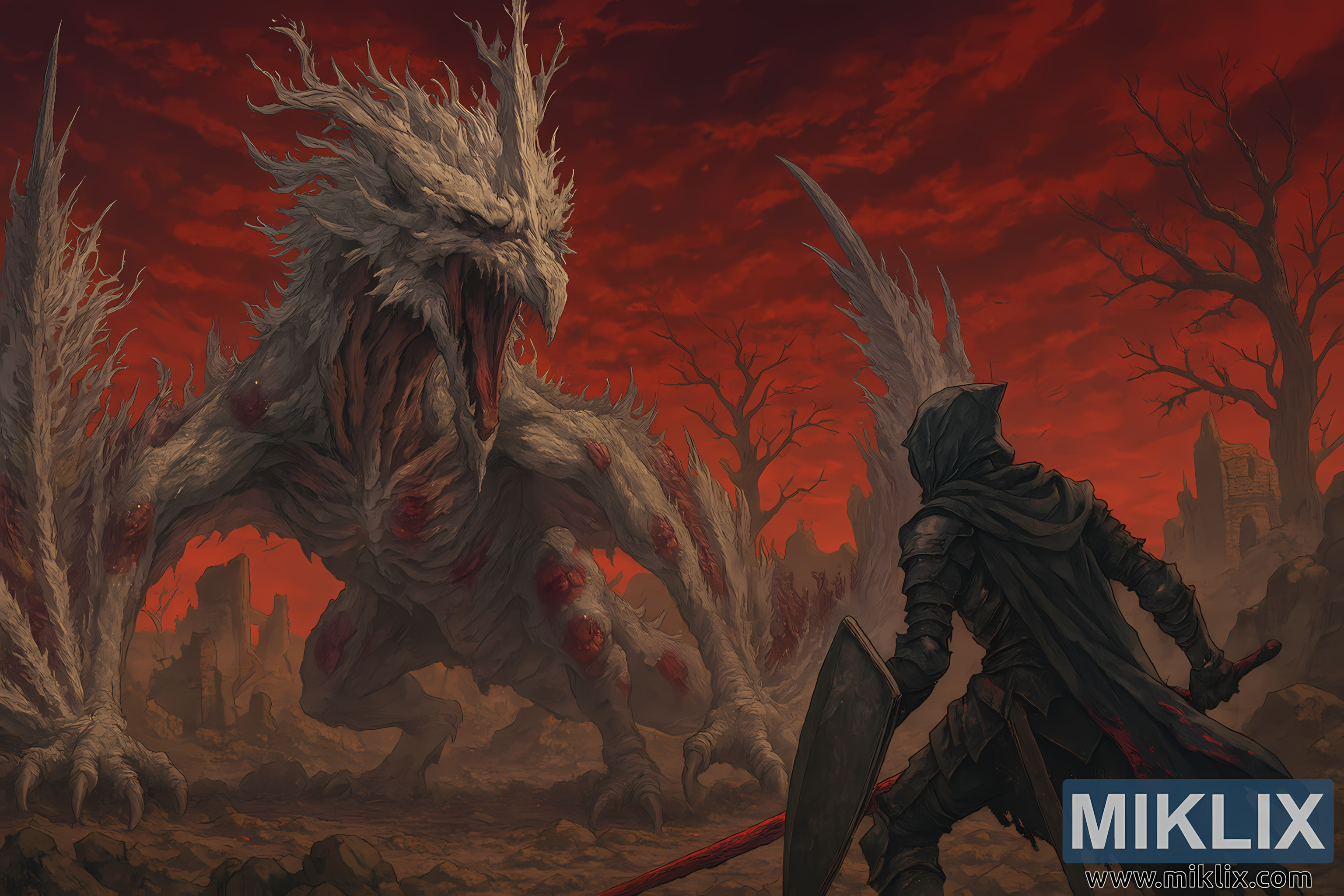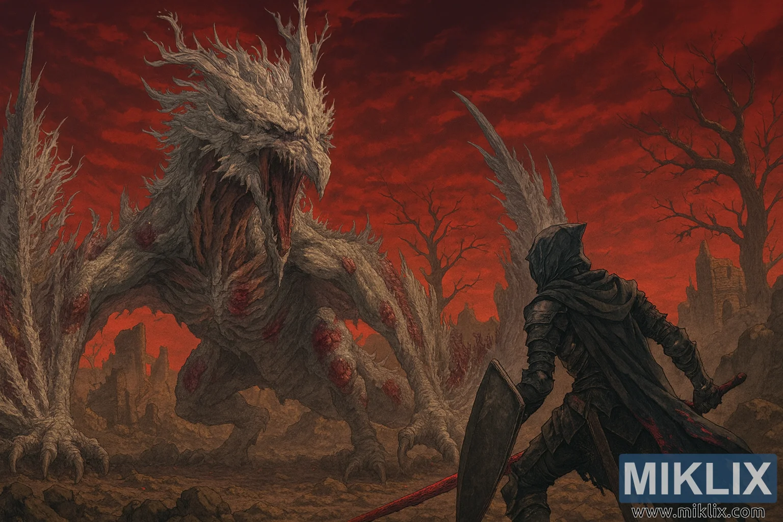 उच्च-रिजोल्युसन एनिमे-शैलीको फ्यान आर्ट छविले क्यालिडको डरलाग्दो उजाड भूमिमा सेट गरिएको एल्डेन रिङको नाटकीय युद्ध दृश्यलाई कैद गर्दछ। यो रचना परिदृश्य-उन्मुख छ, स्केल र गतिलाई जोड दिन्छ। छविको बायाँ छेउमा Decaying Ekzykes, एक विशाल, पातलो फ्रेम भएको विचित्र र सडिरहेको ड्र्यागन देखिन्छ। यसको हड्डी-सेतो माने विषाक्त हावामा फडफडाउँछ, र यसको पखेटा - च्यातिएको र रातो-शिरा - खतरनाक रूपमा फैलिन्छ। ड्र्यागनको खाली माउले रातो सड्ने सासको धारा फुक्छ, जुन संक्षारक कणहरूको बादलमा हावामा घुम्छ। यसको मासु कच्चा, रातो घाउ र छिलिएका तराजुले भरिएको छ, जसले प्राचीन भ्रष्टाचार र रोगको भावना जगाउँछ।