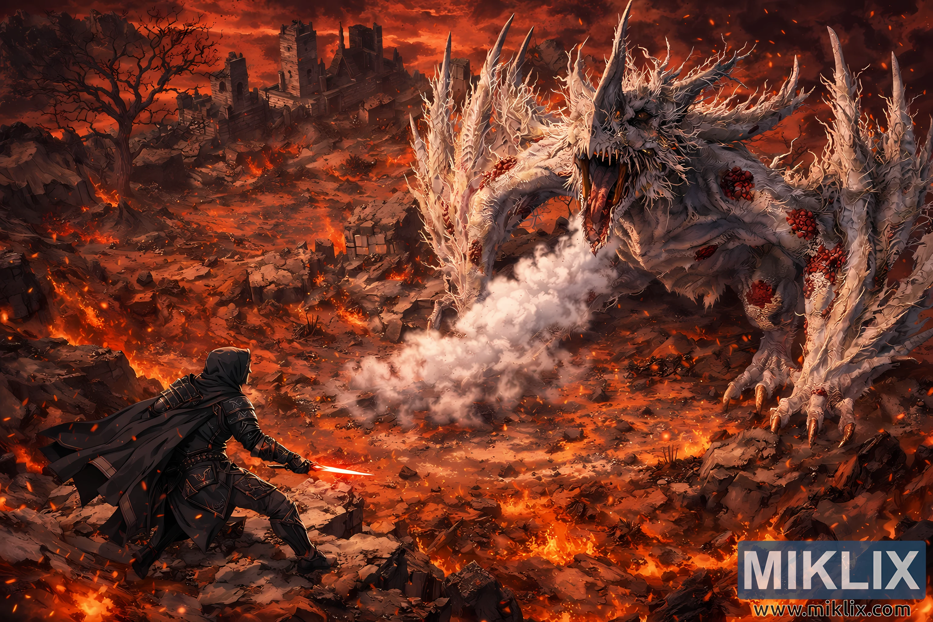 यो उच्च-कोण, आइसोमेट्रिक चित्रणले एल्डेन रिंगबाट क्यालिडको उजाड क्षेत्रमा भएको चरम युद्धलाई चित्रण गर्दछ, जसले वातावरणको विशाल स्केल र योद्धा र राक्षस बीचको घातक तनाव दुवैलाई कैद गर्दछ। क्यामेरा धेरै पछाडि तानिएको छ र माथि उठाइएको छ, जसले दरारहरू, चम्किलो अंगारोहरू, र भाँचिएको पृथ्वीबाट बग्ने पग्लिएको प्रकाशको नदीहरूले भरिएको रातो फोहोर जमिनको विस्तृत विस्तार प्रकट गर्दछ। सम्पूर्ण परिदृश्य दमनकारी रातो र सुन्तला रंगले नुहाइएको छ, जबकि खरानी आगोको हिउँ जस्तै हावामा बगिरहेको छ।