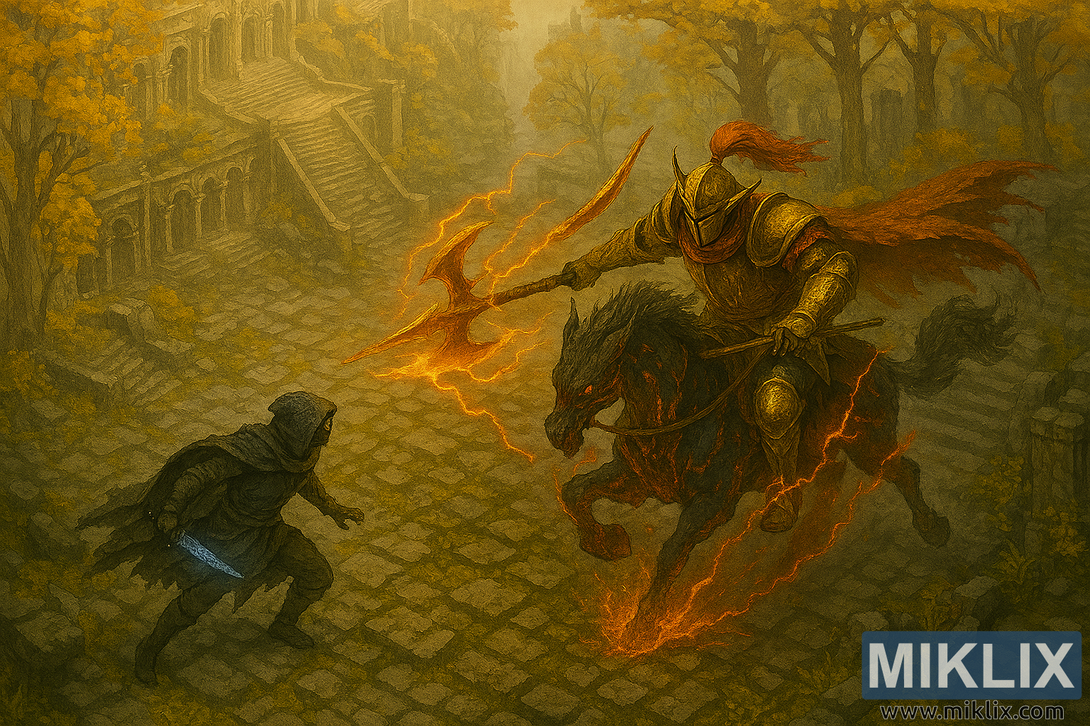 क्यापिटल आउटस्कर्ट्समा ड्र्याकोनिक ट्री सेन्टिनेलसँग लडिरहेको टार्निश्डको महाकाव्य आइसोमेट्रिक एल्डेन रिङ फ्यान आर्ट।