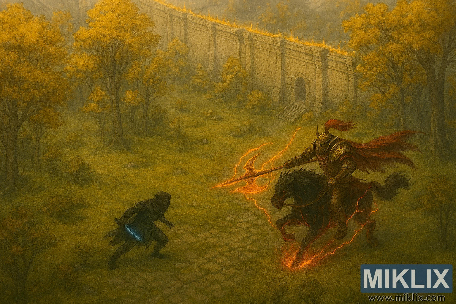 उच्च-रिजोल्युसन, ल्याण्डस्केप-उन्मुख एनिमे-शैलीको डिजिटल चित्रले एल्डेन रिङमा टार्निश्ड र ड्र्याकोनिक ट्री सेन्टिनेल बीचको युद्धको नाटकीय ओभरहेड दृश्य प्रस्तुत गर्दछ। दृश्य खुला वुडल्याण्ड क्लियरिङ्गमा सेट गरिएको छ, सुनौलो शरद ऋतुको पातहरू भएका अग्ला पातलो रूखहरूले घेरिएको। भू-भाग फुटेका ढुङ्गाका बाटोहरू, घाँसे प्याचहरू, र छरिएका जमिनको झाडीको मिश्रण हो, जसले शहरको किनारभन्दा बाहिर जंगली, अदम्य वातावरण जगाउँछ।