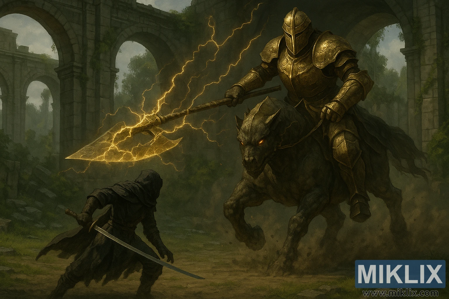वातावरणले द्वन्द्वलाई यसरी फ्रेम गर्छ कि यसले स्केल र मुड दुवैलाई रेखांकित गर्छ। प्राचीन ढुङ्गाका मेहराबहरू र जलवायु जस्तै संरचनाहरू पृष्ठभूमिभरि फैलिएका छन्, आंशिक रूपमा भाँचिएका छन् र प्रकृतिले पुनः प्राप्त गरेका छन्। आइभी, काई र घस्रने पातहरू फिक्का ढुङ्गामा टाँसिएका छन्, जबकि कुहिरोले भरिएको प्रकाशले खाली ठाउँहरू र खोलहरूबाट फिल्टर गर्दछ, वायुमण्डलीय धुंधको खल्तीहरू सिर्जना गर्दछ। रंगहरू असंतृप्त हरियो, खैरो र मौन सुनौलाहरू तिर झुक्छन्, जसले दृश्यलाई एक उदास, विनाशकारी स्वर दिन्छ। टार्निश्ड सानो देखिन्छ तर अग्लो नाइट र भोल्टेड भग्नावशेषहरू विरुद्ध विद्रोही देखिन्छ, जसले विशाल, दिव्य खतराको विरुद्धमा उभिएको एक्लो, कमजोर योद्धाको क्लासिक एल्डेन रिंग भावनालाई जगाउँछ। समग्रमा, छविले यथार्थवादलाई उच्च कल्पनासँग जोड्दछ, हलबर्डको बिजुली चार्ज गरिएको स्विंग र कटानाको हताश काउन्टर कटले द्वन्द्वको भाग्य निर्णय गर्नु अघिको एकल, चार्ज गरिएको क्षणलाई कैद गर्दछ।