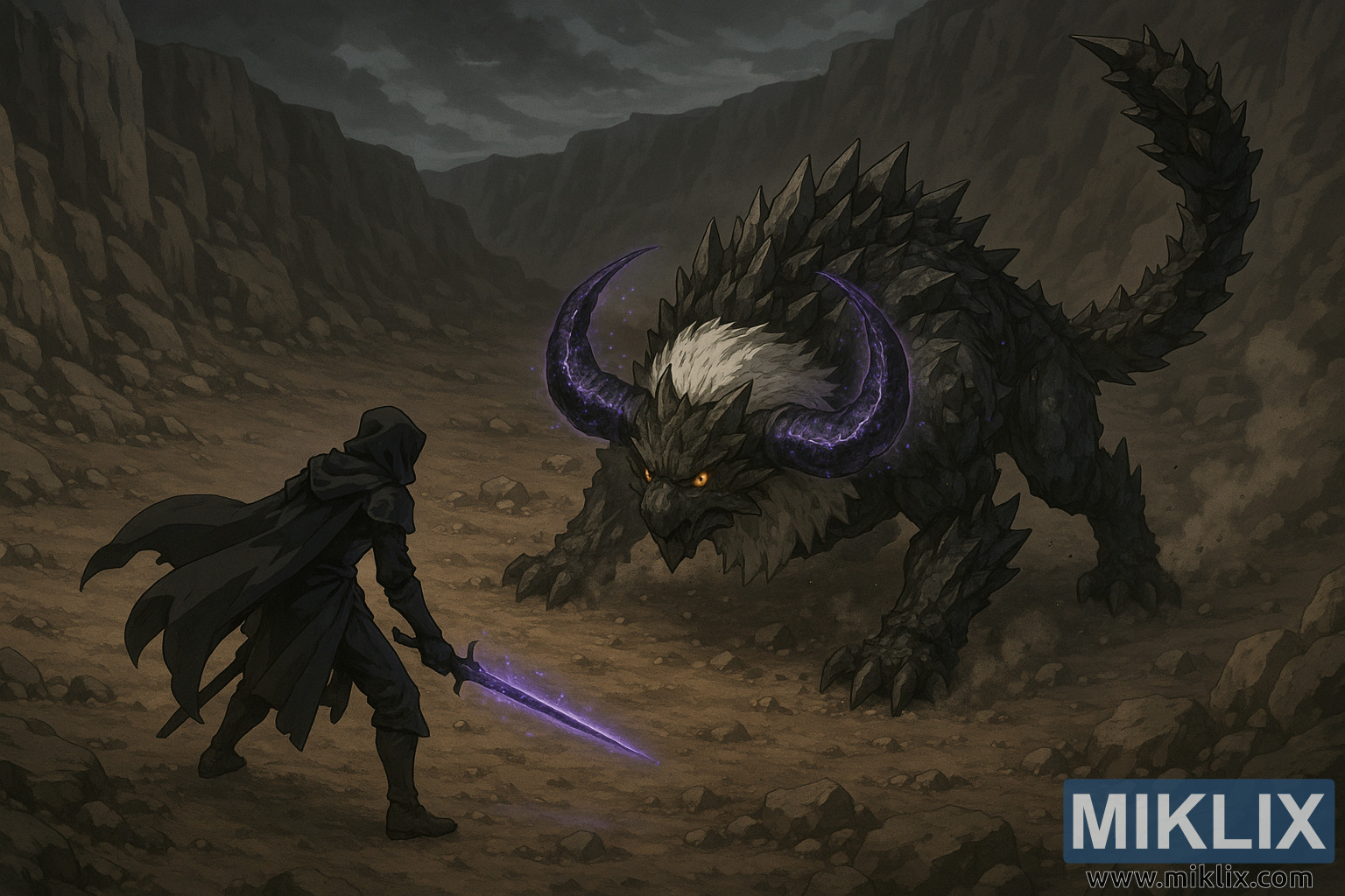 आइसोमेट्रिक संरचनाले स्पष्ट दृश्य पदानुक्रम सिर्जना गर्दछ: कलंकित एक एक्लो, दृढ चुनौतीकर्ताको रूपमा र फलिङस्टार जनावर एक प्रमुख, ब्रह्माण्डीय खतराको रूपमा। तिनीहरू बीचको दूरीले खाली जमिनको फराकिलो भाग छोड्छ, जसले आसन्न लडाईको प्रत्याशालाई बढाउँछ। माटोको खैरो र खैरो रङहरूले प्यालेटमा प्रभुत्व जमाउँछन्, जीवन्त बैजनी ऊर्जा प्रभावहरूद्वारा विराम चिन्हित, जसले आँखा तान्छ र अलौकिक कन्ट्रास्ट प्रदान गर्दछ। समग्रमा, छविले एक तनावपूर्ण, पूर्व-युद्ध क्षणलाई कैद गर्दछ, स्केल, अलगाव, र एल्डेन रिंगको संसारलाई परिभाषित गर्ने उदास भव्यतालाई जोड दिन्छ।