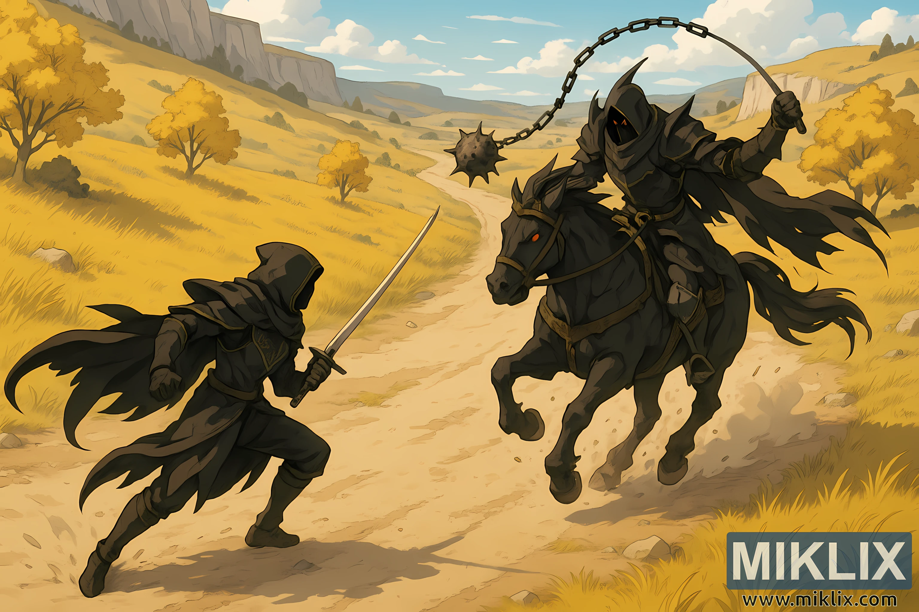 छविले एल्डेन रिङबाट प्रेरित एनिमे-शैलीको फ्यान आर्ट दृश्यलाई चित्रण गर्दछ, जुन पछाडि तानिएको, माथिल्लो आइसोमेट्रिक दृष्टिकोणबाट देखाइएको छ जसले द्वन्द्व र वरपरको परिदृश्य दुवैलाई जोड दिन्छ। दर्शकले अल्टस राजमार्गलाई तल हेर्छ जब यो घुमाउरो सुनौलो पहाडहरू हुँदै बग्छ, स्केल र खुलापनको बलियो भावना सिर्जना गर्दछ। दृश्यको केन्द्रमा, दुई आकृतिहरू धुलो सडकमा एकअर्काको सामना गर्छन्, आसन्न प्रभावको क्षणमा जमेको। तल्लो बायाँमा टार्निश्ड खडा छ, अँध्यारो, बग्ने कालो चक्कु कवचमा सजिएको। कवचलाई चारकोल र मौन कालोको तहदार छायाँमा रेन्डर गरिएको छ, हुड, छाती र बेल्टको किनारहरू ट्रेस गर्ने सूक्ष्म सुनको कढ़ाईको साथ। यस उच्च दृष्टिकोणबाट, टार्निश्डको सिल्हूट पातलो र चुस्त देखिन्छ, लुगा र कपडा अगाडिको गतिलाई सुझाव दिन पछाडि पछाडि। चित्रले माथितिर विकर्ण कोणमा पातलो तरवार समातेको छ, यसको फिक्का ब्लेडले न्यानो सूर्यको किरण समात्छ र गाढा कवचको विरुद्धमा तीव्र रूपमा उभिएको छ। टार्निश्डको मुद्रा कम र ब्रेस्ड छ, घुँडा झुकेको छ र खुट्टाहरू सडकमा दृढतापूर्वक राखिएको छ, तयारी, परिशुद्धता र नियन्त्रित आक्रामकता व्यक्त गर्दछ। रचनाको दायाँ छेउमा रहेको टार्निश्डको विपरीत, नाइट्स क्याभलरी एक शक्तिशाली कालो वारहर्समा सवार छ। माथिबाट, क्याभलरीको भारी कवच दाँतेदार र प्रभावशाली देखिन्छ, कोणात्मक प्लेटहरू र च्यातिएको कपडाले बाहिरी रूपमा तरंगहरू देखाउँछ, जसले सवारलाई वर्णक्रमीय, लगभग अमानवीय उपस्थिति दिन्छ। हुड भएको हेल्मले अनुहारको कुनै पनि निशान लुकाउँछ, मृत नाइटको भावनालाई बलियो बनाउँछ। क्याभलरीको हात माथि उठाइएको छ, फराकिलो चापमा काँटेदार फ्लेल घुमाउँदै; चेन हावामा नाटकीय रूपमा घुम्छ, र फलामको टाउको सवार र विपक्षीको बीचमा अशुभ रूपमा झुण्डिएको छ, कच्चा, कुचल्ने बलको खतरालाई जोड दिँदै। वारहर्स सडकमा अगाडि बढ्छ, यसको खुरहरू उठाउँछन् र जमिनमा छरिएका धुलो उठाउँछन्। यो दूरीबाट पनि एउटा चम्किलो रातो आँखा देखिन्छ, जसले अन्यथा न्यानो, प्राकृतिक प्यालेटसँग विपरित एक अलौकिक केन्द्र बिन्दु थप्छ। छविमा वातावरणले प्रमुख भूमिका खेल्छ। अल्टस पठार सुनौलो घाँसको नरम तहहरूमा बाहिर फैलिएको छ, पहेंलो-पात भएका रूखहरूले भरिएको छ जुन शरद ऋतुको रंग योजना प्रतिध्वनि गर्दछ। दूरीमा फिक्का ढुङ्गाका चट्टानहरू उठ्छन्, तिनीहरूका किनारहरू वायुमण्डलीय दृष्टिकोणले नरम हुन्छन्, जबकि कोमल बादलहरू नीलो आकाशमा बग्छन्। माथिल्लो दृष्टिकोणले घुमाउरो बाटोलाई पृष्ठभूमिमा गहिरो रूपमा आँखा लैजान अनुमति दिन्छ, गहिराइ बढाउँछ र ध्यान केन्द्रीय टकरावमा फर्काउँछ। समग्रमा, चित्रणले कार्य र वाता
