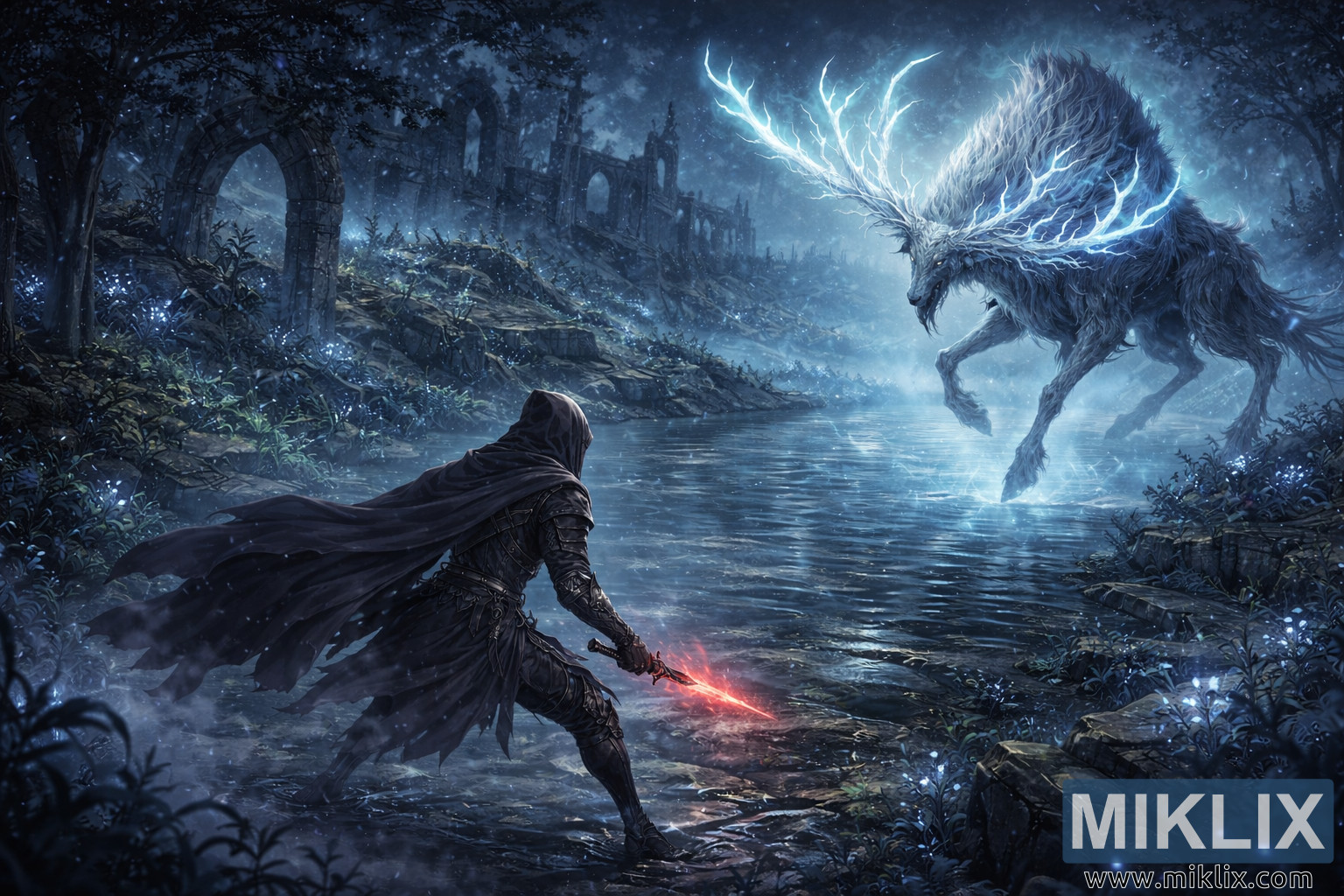 फ्रेमको माथिल्लो दायाँतिर, कलंकितको विपरीत, रीगल पूर्वज आत्माले खुला ठाउँमा प्रभुत्व जमाउँछ। यसको वर्णक्रमीय शरीर यस सुविधाबाट हल्का देखिन्छ, मानौं आंशिक रूपमा जमिनमा बाँधिएको छ। प्राणी छलाङको बीचमा समातिएको छ, खुरहरू पानीबाट उठेका छन् र पछाडि चम्किला थोपाहरू छन्। यसको विशाल सिङहरू बिजुलीको जमेको विस्फोट जस्तै बाहिर हाँगाहरू छन्, प्रत्येक चम्किलो फिलामेन्टले पातलो प्रतिबिम्बहरू फ्याँक्छ जुन तलको लहरदार सतहमा फैलिएको छ। यसको शरीर भित्रको चमक बिस्तारै धड्किन्छ, जसले प्राचीन, थकित र स्थायी ईश्वरीय उपस्थितिको छाप दिन्छ।