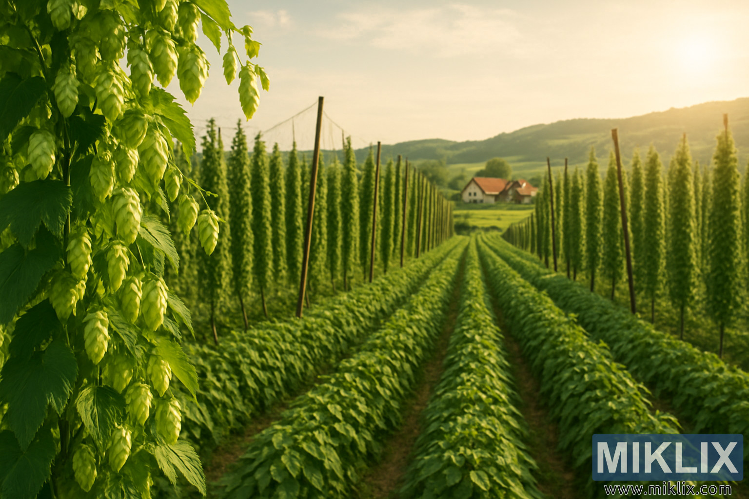 सुनौलो दिउँसोको घाम मुनि ओपल हप फिल्डको उच्च-रिजोल्युसन ल्यान्डस्केप तस्बिर। यो तस्बिरमा अग्रभूमिमा क्यास्केडिङ हप कोनहरू, बोटबिरुवाहरूको ट्रेलिज्ड पङ्क्तिहरू, र घुमाउरो पहाडहरूमा अवस्थित ग्रामीण फार्महाउस देखाइएको छ, जसले शान्त पादरीय मूडलाई जगाउँछ।
