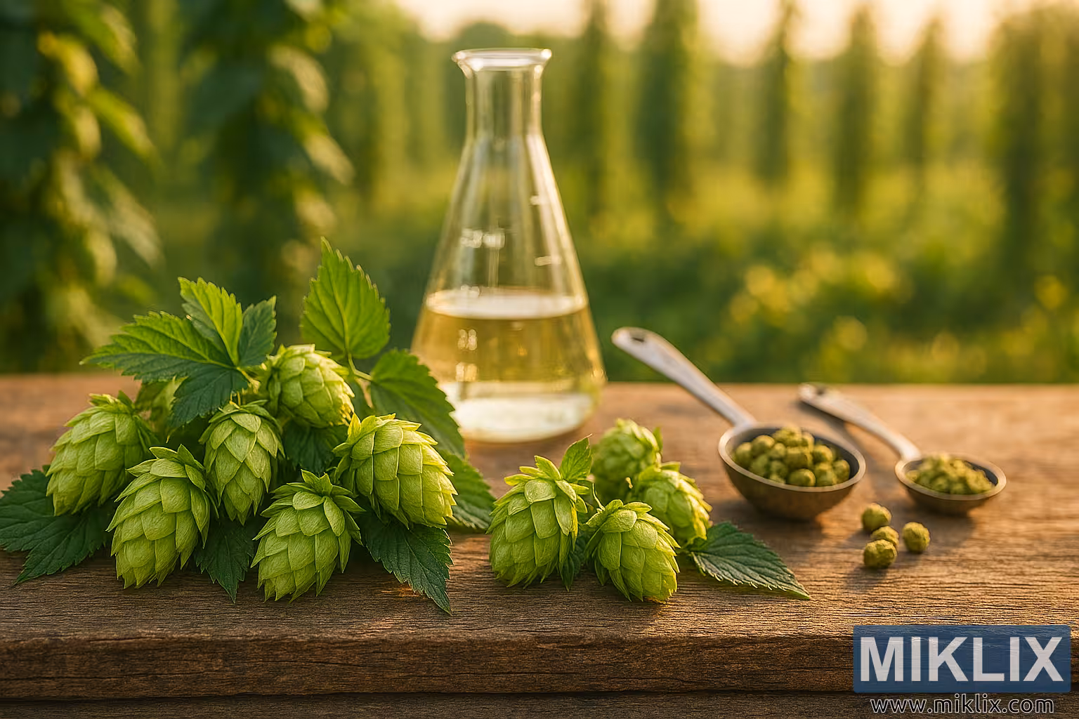 बीचको जमिनले ब्रुइङ प्रक्रियामा सूक्ष्म संकेत प्रस्तुत गर्दछ। नक्काशी गरिएको भोल्युम चिन्हहरू भएको अग्लो, पारदर्शी गिलासको बीकर केन्द्रबाट अलि टाढा उभिएको छ, आंशिक रूपमा सूर्यको प्रकाश समात्ने पारदर्शी तरल पदार्थले भरिएको छ। यसको छेउमा, दुईवटा कलंकित धातु नाप्ने चम्चाहरू विकर्ण रूपमा आराम गर्छन्, प्रत्येकमा पेलेटाइज्ड हप्स हुन्छन्। दर्शकको सबैभन्दा नजिकको चम्चामा साना, बेलनाकार हरियो पेलेटहरू हुन्छन्, जबकि दोस्रो चम्चा, अलिकति फोकस बाहिर, संरचनामा पहिलोलाई प्रतिबिम्बित गर्दछ। यी तत्वहरूले प्राकृतिक सामग्रीहरूलाई प्राविधिक प्रक्रियासँग जोड्दै, घरमै ब्रुइङमा संलग्न परिशुद्धता र कलात्मकताको सुझाव दिन्छ।