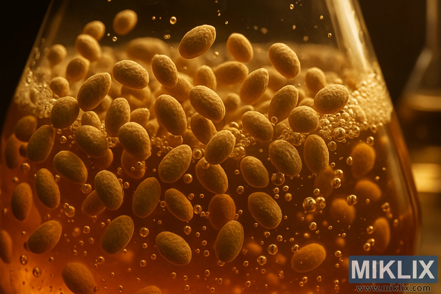 यो छविले किण्वनको सूक्ष्म संसारमा एक घनिष्ठ, लगभग काव्यात्मक झलक प्रदान गर्दछ, जहाँ जीवविज्ञान, रसायन विज्ञान, र शिल्प कौशल एकल, प्रभावशाली क्षणमा मिल्छ। रचनाको केन्द्रमा सुनौलो-एम्बर तरल पदार्थले भरिएको प्रयोगशाला फ्लास्क छ, यसको सतह गतिले जीवन्त छ। तरल पदार्थ भित्र निलम्बित अनगिन्ती अंडाकार आकारका कणहरू - खमीर कोषहरू - प्रत्येक रूपान्तरणको सानो इन्जिन हुन्। तिनीहरूका रूपहरू तीव्र रूपमा परिभाषित छन्, बनावट सतहहरू र आकार र अभिमुखीकरणमा सूक्ष्म भिन्नताहरू प्रकट गर्दै। केही नवोदित देखिन्छन्, अरू कोमल धाराहरूमा बगिरहेका छन्, सबैले किण्वनको गतिशील कोरियोग्राफीमा योगदान पुर्याउँछन्। छविको स्पष्टता र फोकसले दर्शकलाई सामान्यतया दृश्यबाट लुकेका सेलुलर जटिलताहरूको कदर गर्न अनुमति दिन्छ, यी सूक्ष्मजीवहरूलाई केवल सामग्रीबाट जैव रासायनिक नाटकमा नायकमा उचाल्छ।